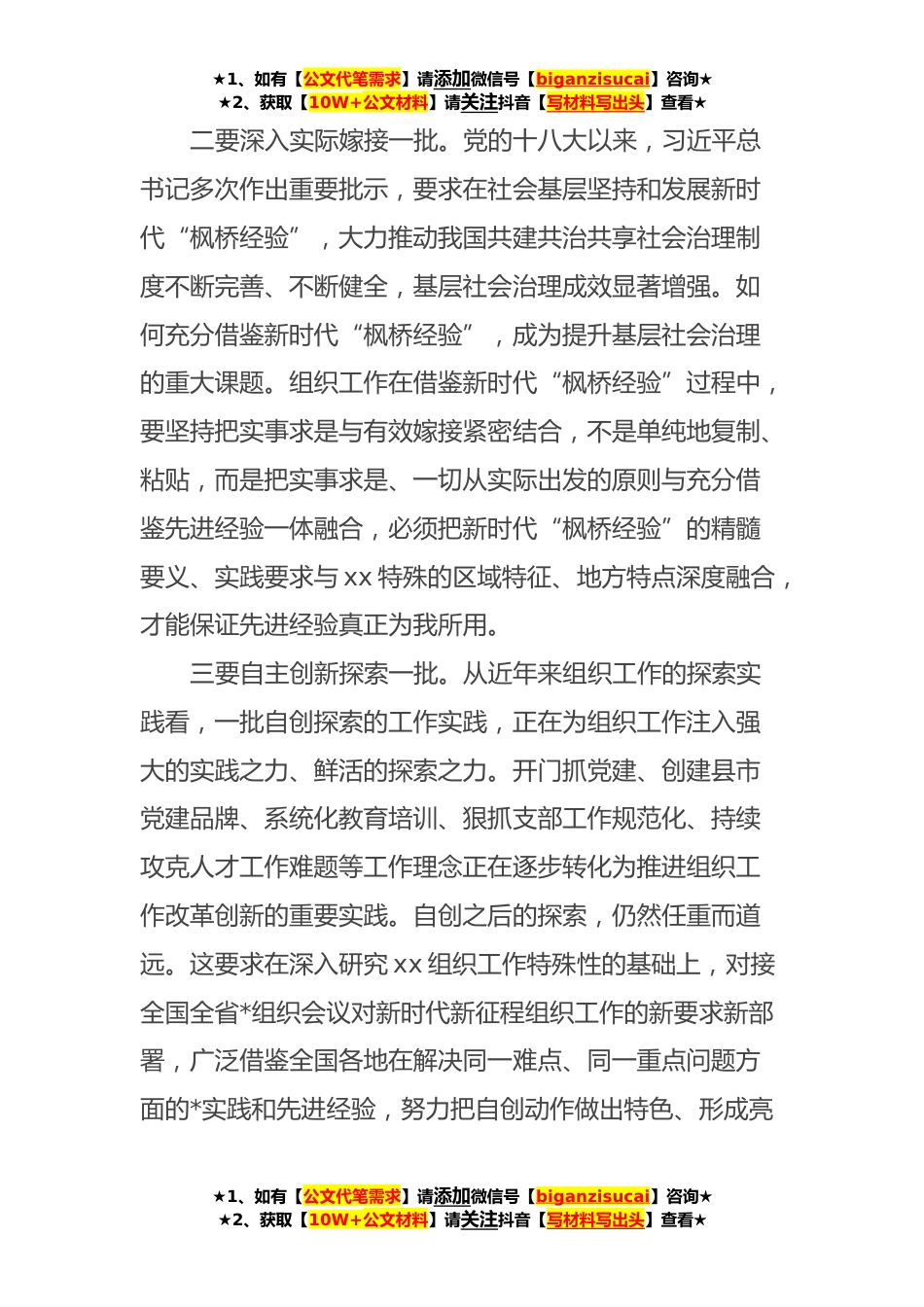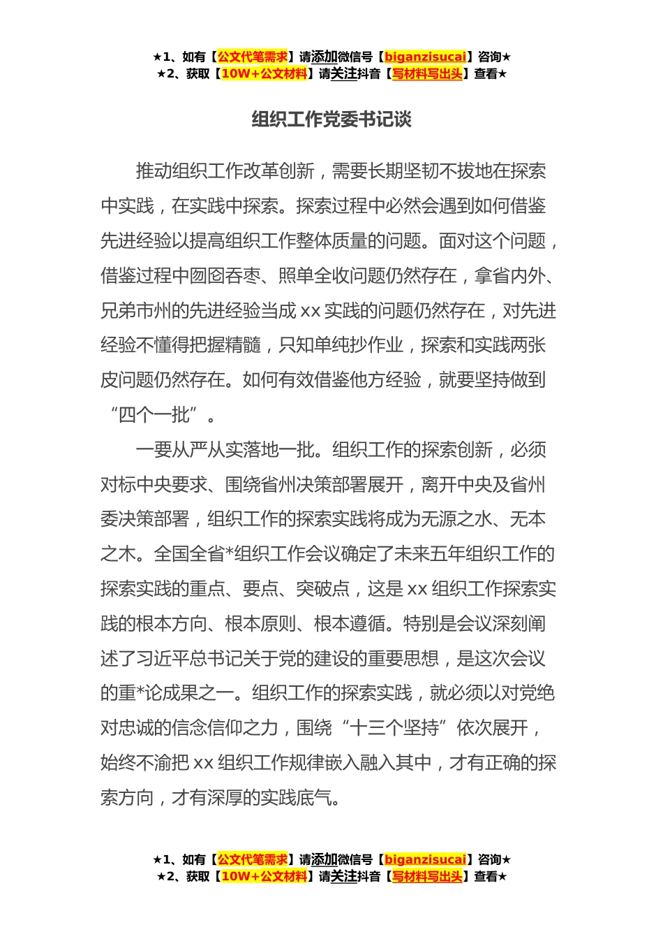 ★1、如有【公文代笔需求】请添加微信号【biganzisucai】咨询★★2、获取【10W+公文材料】请关注抖音【写材料写出头】查看★组织工作党委书记谈推动组织工作改革创新,需要长期坚韧不拔地在探索中实践,在实践中探索。探索过程中必然会遇到如何借鉴先进经验以提高组织工作整体质量的问题。面对这个问题,借鉴过程中囫囵吞枣、照单全收问题仍然存在,拿省内外、兄弟市州的先进经验当成xx实践的问题仍然存在,对先进经验不懂得把握精髓,只知单纯抄作业,探索和实践两张皮问题仍然存在。如何有效借鉴他方经验,就要坚持做到“四个一批”。一要从严从实落地一批。组织工作的探索创新,必须对标中央要求、围绕省州决策部署展开,离开中央及省州委决策部署,组织工作的探索实践将成为无源之水、无本之木。全国全省*组织...