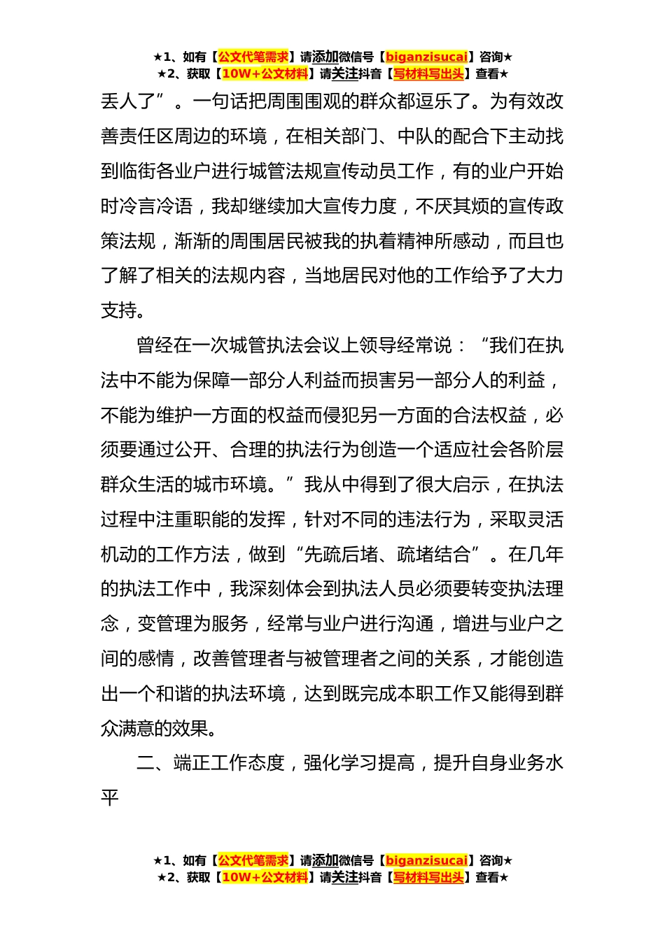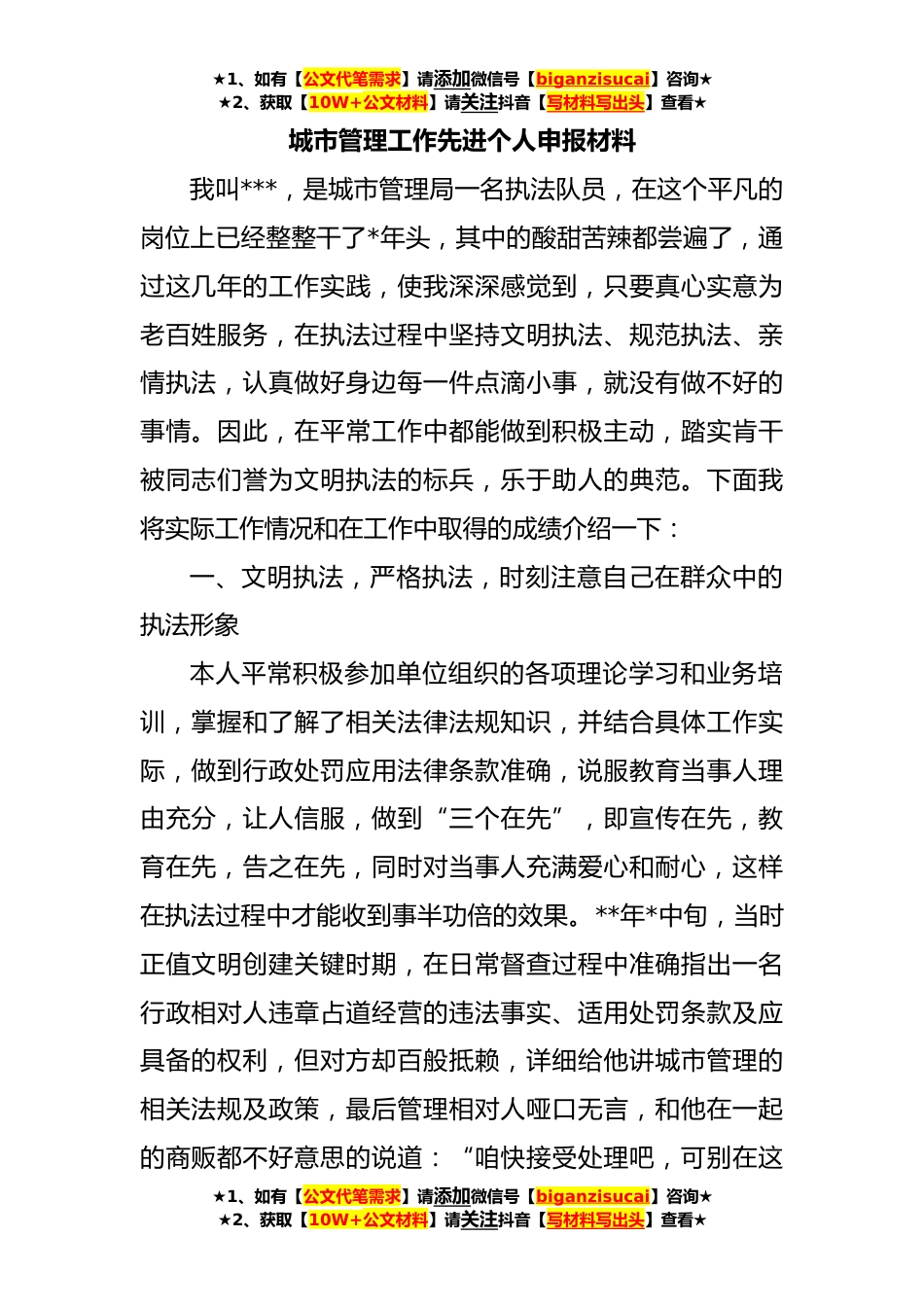 ★1、如有【公文代笔需求】请添加微信号【biganzisucai】咨询★★2、获取【10W+公文材料】请关注抖音【写材料写出头】查看★城市管理工作先进个人申报材料我叫***,是城市管理局一名执法队员,在这个平凡的岗位上已经整整干了*年头,其中的酸甜苦辣都尝遍了,通过这几年的工作实践,使我深深感觉到,只要真心实意为老百姓服务,在执法过程中坚持文明执法、规范执法、亲情执法,认真做好身边每一件点滴小事,就没有做不好的事情。因此,在平常工作中都能做到积极主动,踏实肯干被同志们誉为文明执法的标兵,乐于助人的典范。下面我将实际工作情况和在工作中取得的成绩介绍一下:一、文明执法,严格执法,时刻注意自己在群众中的执法形象本人平常积极参加单位组织的各项理论学习和业务培训,掌握和了解了相关法律法...