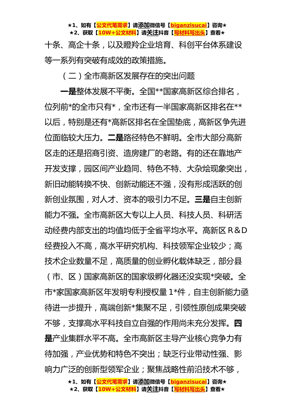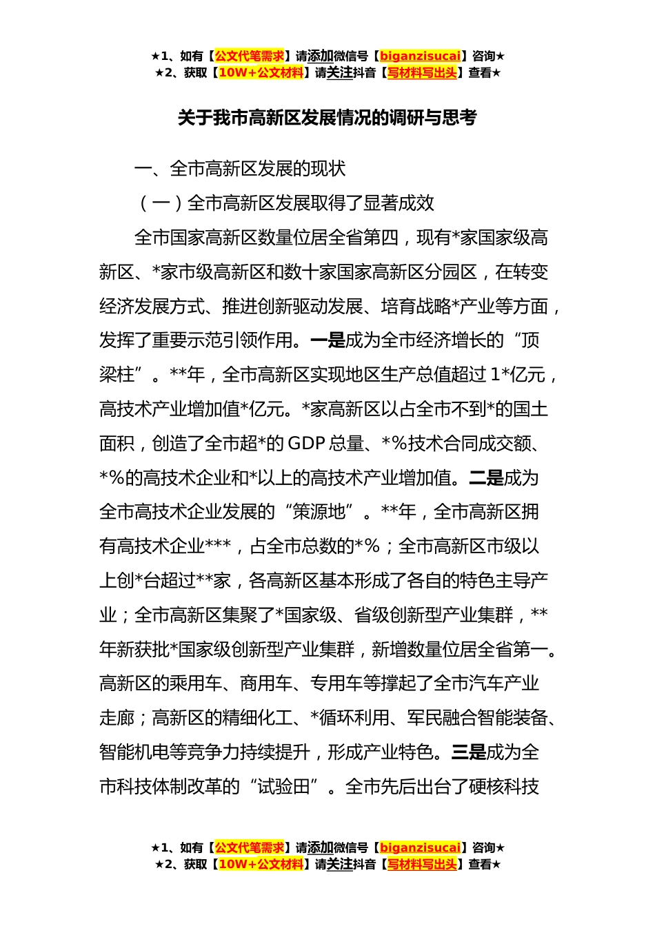 ★1、如有【公文代笔需求】请添加微信号【biganzisucai】咨询★★2、获取【10W+公文材料】请关注抖音【写材料写出头】查看★关于我市高新区发展情况的调研与思考一、全市高新区发展的现状(一)全市高新区发展取得了显著成效全市国家高新区数量位居全省第四,现有*家国家级高新区、*家市级高新区和数十家国家高新区分园区,在转变经济发展方式、推进创新驱动发展、培育战略*产业等方面,发挥了重要示范引领作用。一是成为全市经济增长的“顶梁柱”。**年,全市高新区实现地区生产总值超过1*亿元,高技术产业增加值*亿元。*家高新区以占全市不到*的国土面积,创造了全市超*的GDP总量、*%技术合同成交额、*%的高技术企业和*以上的高技术产业增加值。二是成为全市高技术企业发展的“策源地”。**年,全市高新区拥有...