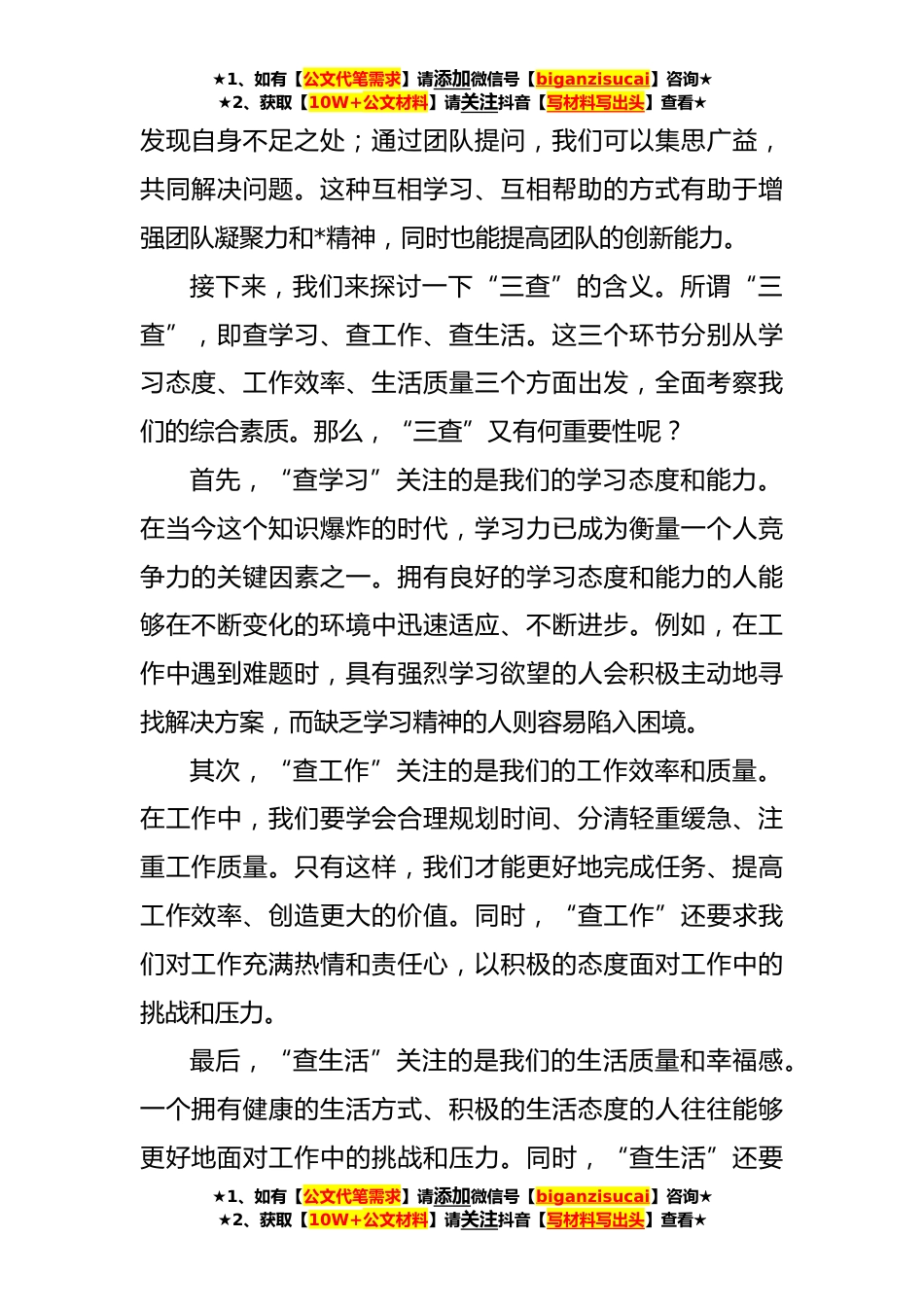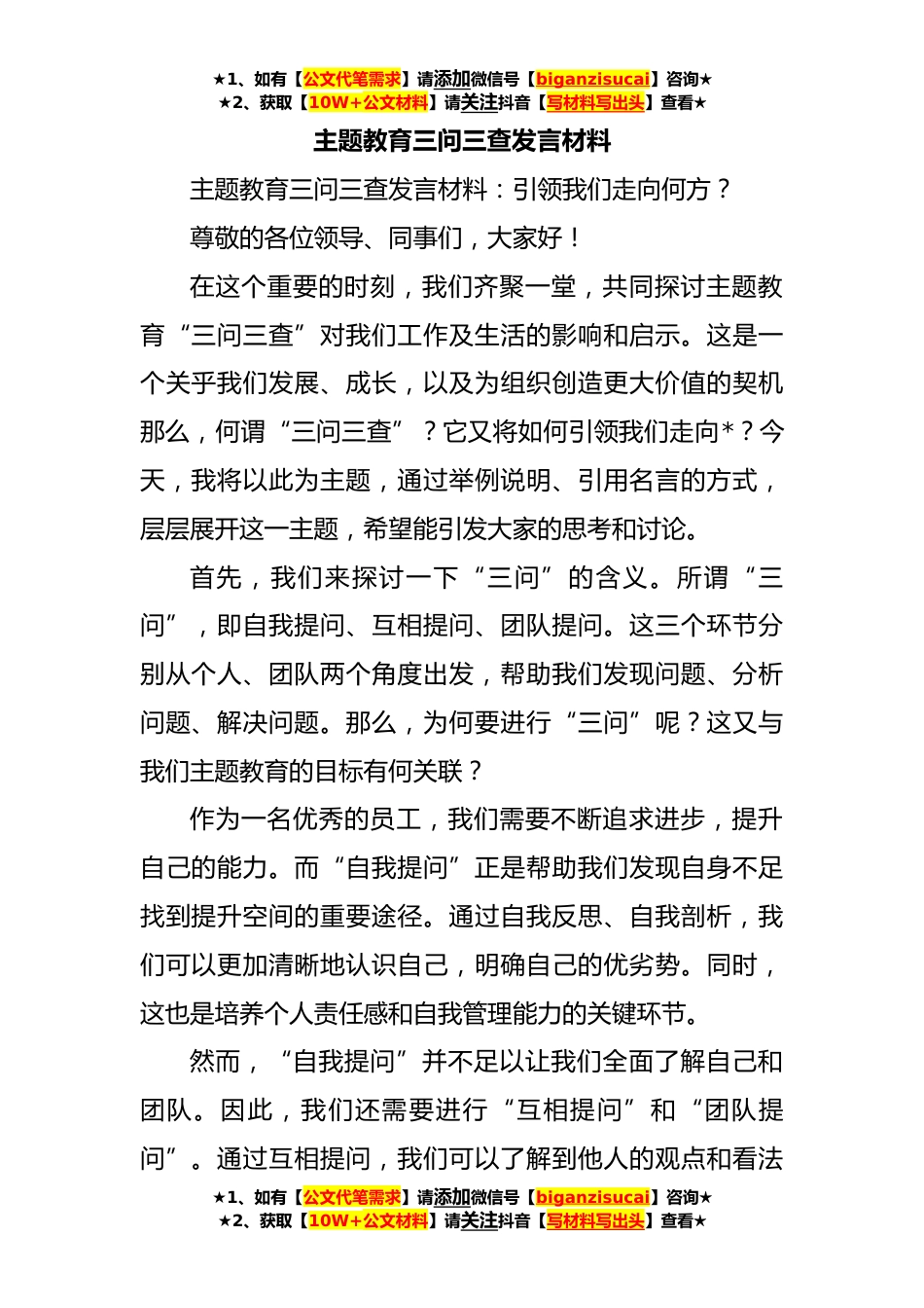 ★1、如有【公文代笔需求】请添加微信号【biganzisucai】咨询★★2、获取【10W+公文材料】请关注抖音【写材料写出头】查看★主题教育三问三查发言材料主题教育三问三查发言材料:引领我们走向何方?尊敬的各位领导、同事们,大家好!在这个重要的时刻,我们齐聚一堂,共同探讨主题教育“三问三查”对我们工作及生活的影响和启示。这是一个关乎我们发展、成长,以及为组织创造更大价值的契机那么,何谓“三问三查”?它又将如何引领我们走向*?今天,我将以此为主题,通过举例说明、引用名言的方式,层层展开这一主题,希望能引发大家的思考和讨论。首先,我们来探讨一下“三问”的含义。所谓“三问”,即自我提问、互相提问、团队提问。这三个环节分别从个人、团队两个角度出发,帮助我们发现问题、分析问题、解决...