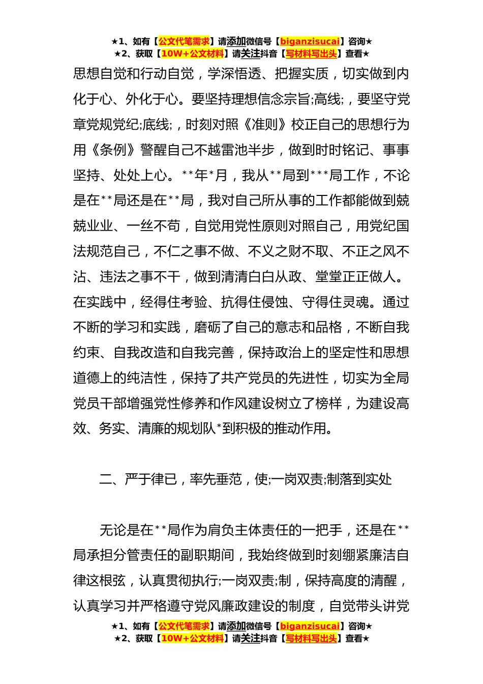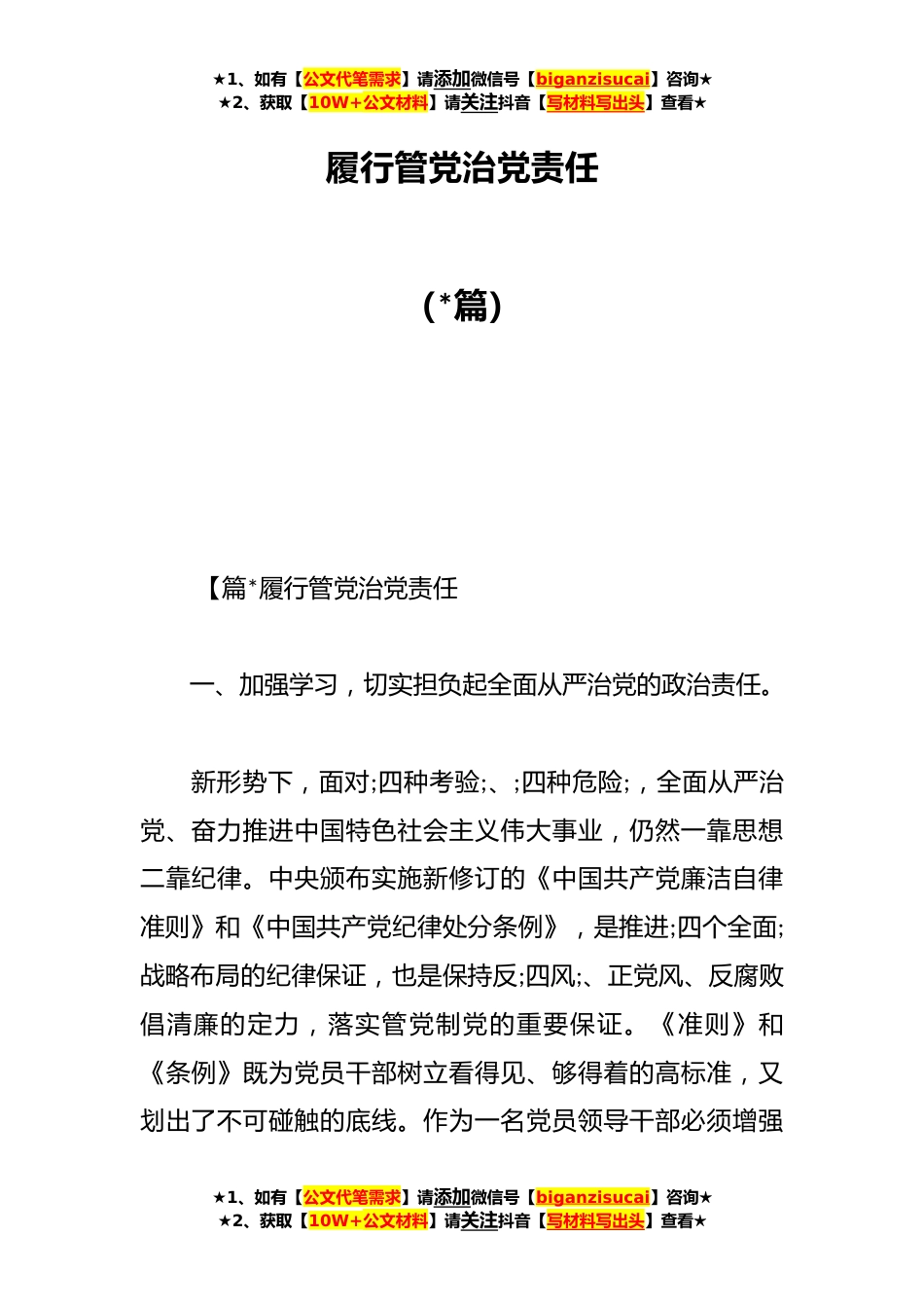 ★1、如有【公文代笔需求】请添加微信号【biganzisucai】咨询★★2、获取【10W+公文材料】请关注抖音【写材料写出头】查看★履行管党治党责任(*篇)【篇*履行管党治党责任一、加强学习,切实担负起全面从严治党的政治责任。新形势下,面对;四种考验;、;四种危险;,全面从严治党、奋力推进中国特色社会主义伟大事业,仍然一靠思想二靠纪律。中央颁布实施新修订的《中国共产党廉洁自律准则》和《中国共产党纪律处分条例》,是推进;四个全面;战略布局的纪律保证,也是保持反;四风;、正党风、反腐败倡清廉的定力,落实管党制党的重要保证。《准则》和《条例》既为党员干部树立看得见、够得着的高标准,又划出了不可碰触的底线。作为一名党员领导干部必须增强★1、如有【公文代笔需求】请添加微信号【biganzisucai】咨...