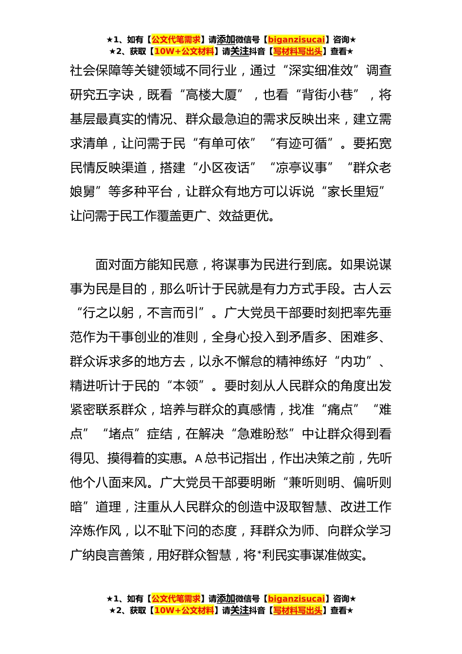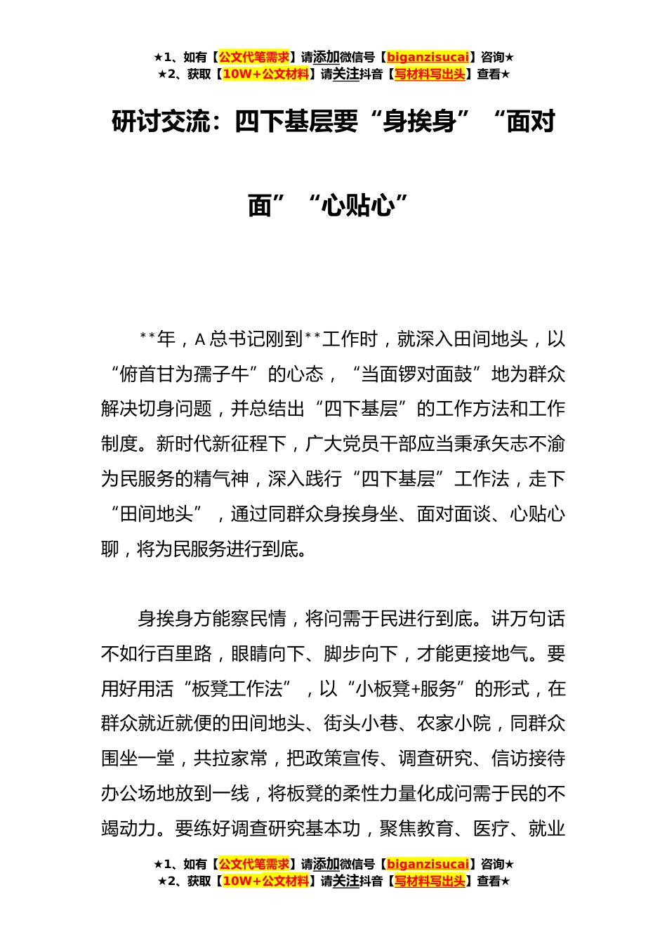 ★1、如有【公文代笔需求】请添加微信号【biganzisucai】咨询★★2、获取【10W+公文材料】请关注抖音【写材料写出头】查看★研讨交流:四下基层要“身挨身”“面对面”“心贴心”**年,A总书记刚到**工作时,就深入田间地头,以“俯首甘为孺子牛”的心态,“当面锣对面鼓”地为群众解决切身问题,并总结出“四下基层”的工作方法和工作制度。新时代新征程下,广大党员干部应当秉承矢志不渝为民服务的精气神,深入践行“四下基层”工作法,走下“田间地头”,通过同群众身挨身坐、面对面谈、心贴心聊,将为民服务进行到底。身挨身方能察民情,将问需于民进行到底。讲万句话不如行百里路,眼睛向下、脚步向下,才能更接地气。要用好用活“板凳工作法”,以“小板凳+服务”的形式,在群众就近就便的田间地头、街头小...