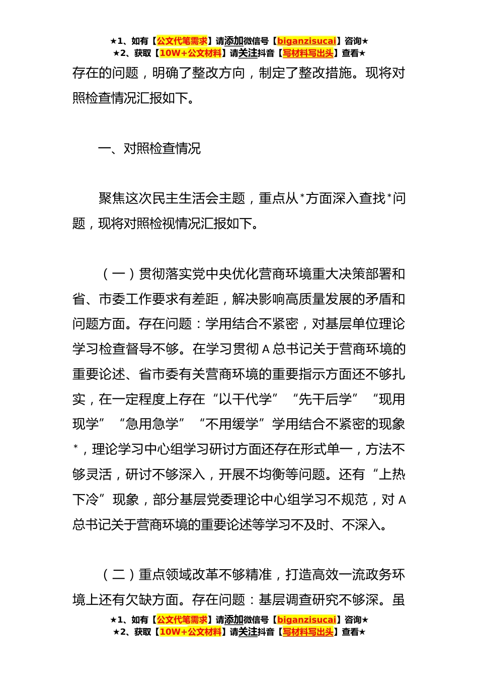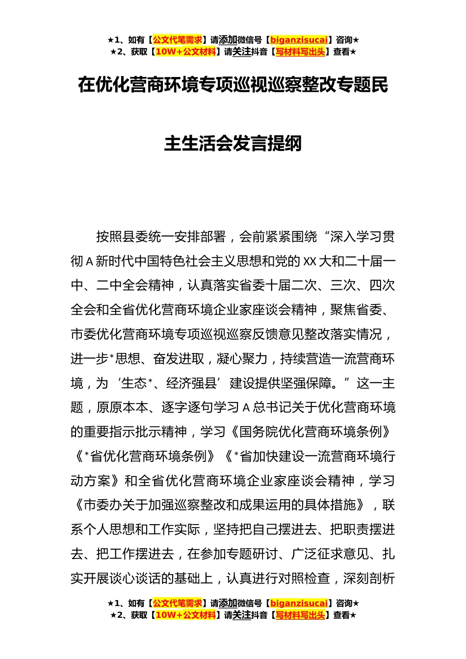 ★1、如有【公文代笔需求】请添加微信号【biganzisucai】咨询★★2、获取【10W+公文材料】请关注抖音【写材料写出头】查看★在优化营商环境专项巡视巡察整改专题民主生活会发言提纲按照县委统一安排部署,会前紧紧围绕“深入学习贯彻A新时代中国特色社会主义思想和党的XX大和二十届一中、二中全会精神,认真落实省委十届二次、三次、四次全会和全省优化营商环境企业家座谈会精神,聚焦省委、市委优化营商环境专项巡视巡察反馈意见整改落实情况,进一步*思想、奋发进取,凝心聚力,持续营造一流营商环境,为‘生态*、经济强县’建设提供坚强保障。”这一主题,原原本本、逐字逐句学习A总书记关于优化营商环境的重要指示批示精神,学习《国务院优化营商环境条例》《*省优化营商环境条例》《*省加快建设一流营商环境...