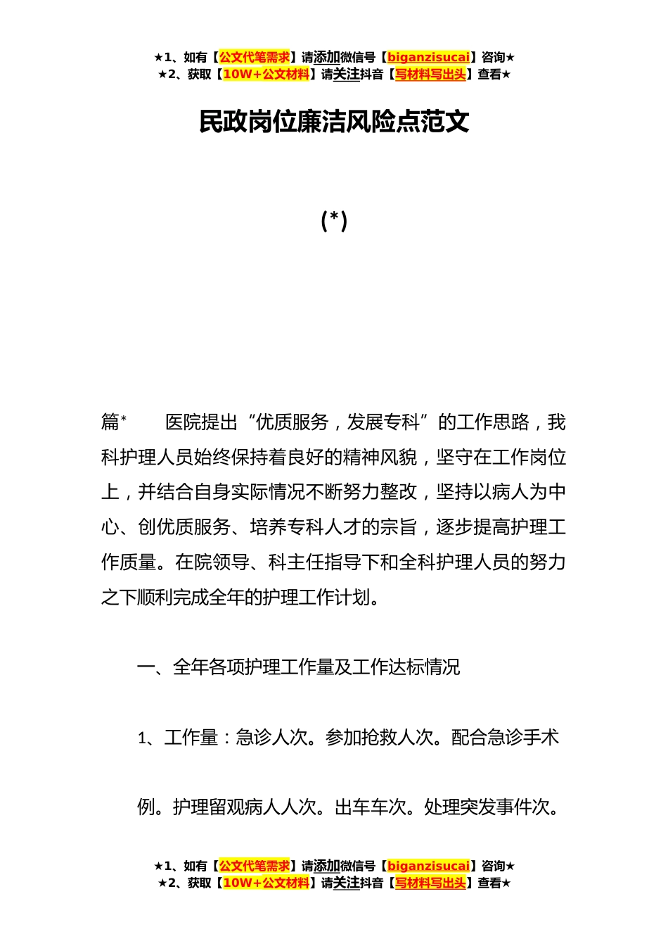 ★1、如有【公文代笔需求】请添加微信号【biganzisucai】咨询★★2、获取【10W+公文材料】请关注抖音【写材料写出头】查看★民政岗位廉洁风险点范文(*)篇*医院提出“优质服务,发展专科”的工作思路,我科护理人员始终保持着良好的精神风貌,坚守在工作岗位上,并结合自身实际情况不断努力整改,坚持以病人为中心、创优质服务、培养专科人才的宗旨,逐步提高护理工作质量。在院领导、科主任指导下和全科护理人员的努力之下顺利完成全年的护理工作计划。一、全年各项护理工作量及工作达标情况1、工作量:急诊人次。参加抢救人次。配合急诊手术例。护理留观病人人次。出车车次。处理突发事件次。★1、如有【公文代笔需求】请添加微信号【biganzisucai】咨询★★2、获取【10W+公文材料】请关注抖音【写材料写出头】查...