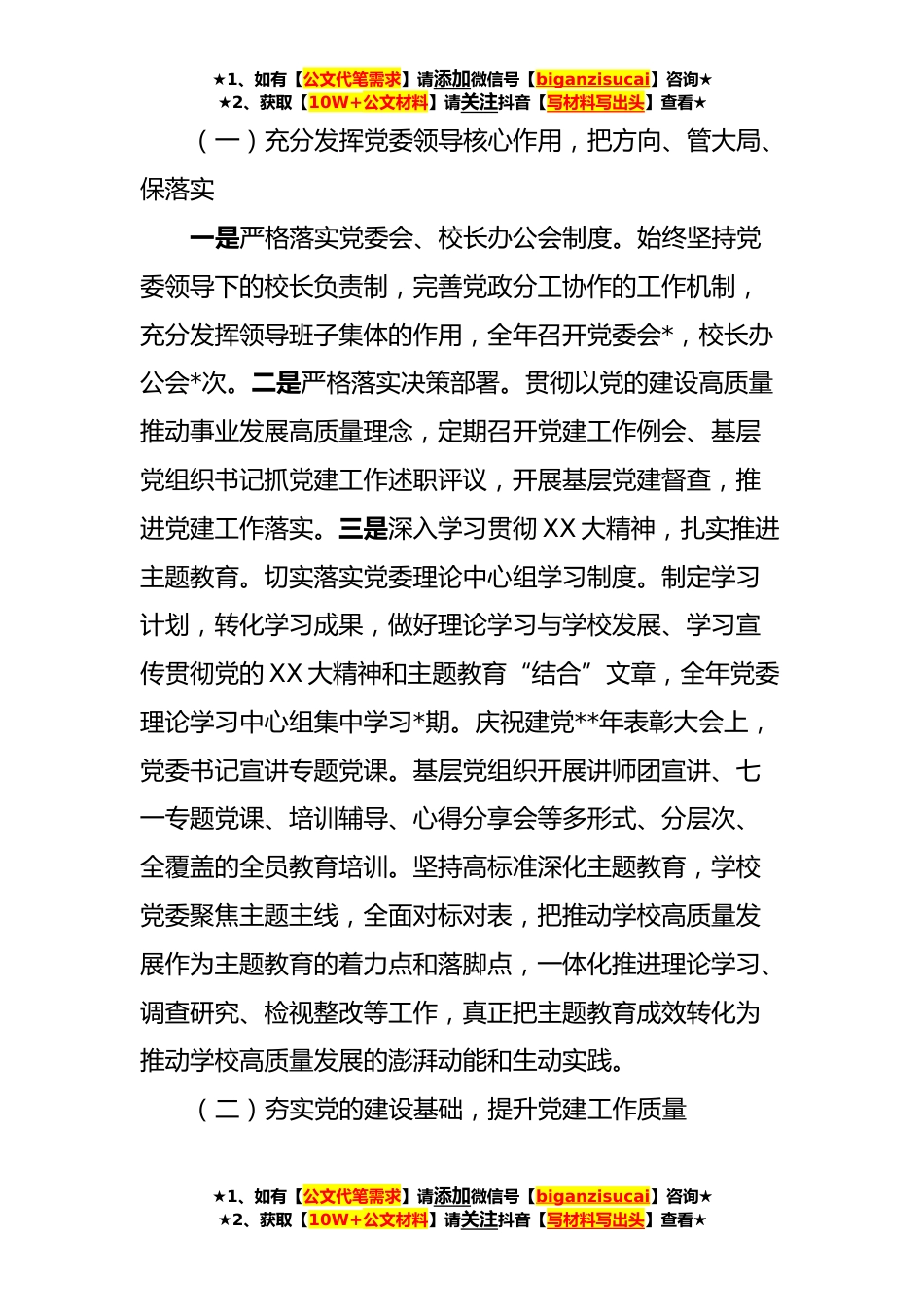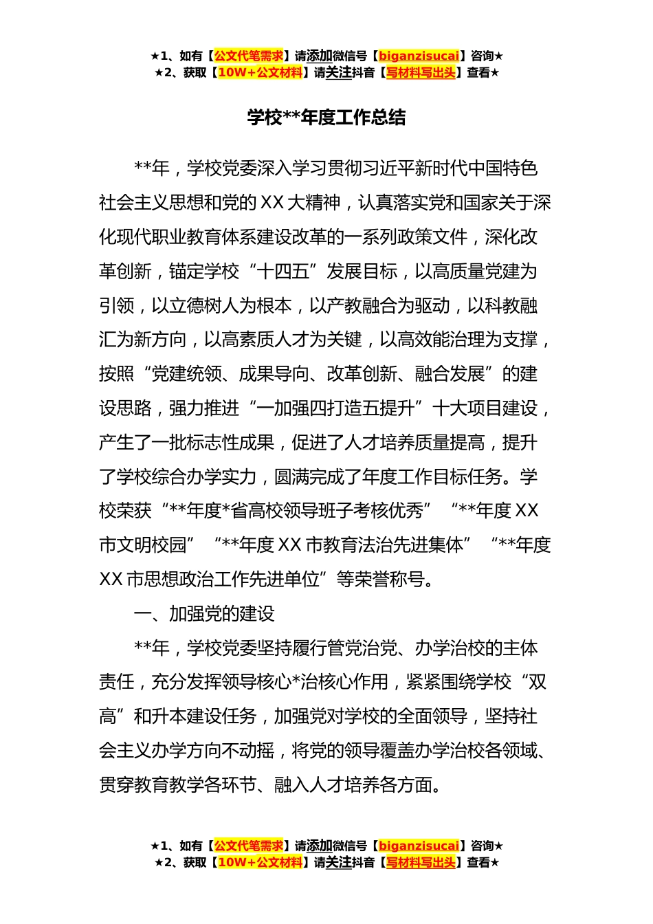 ★1、如有【公文代笔需求】请添加微信号【biganzisucai】咨询★★2、获取【10W+公文材料】请关注抖音【写材料写出头】查看★学校**年度工作总结**年,学校党委深入学习贯彻习近平新时代中国特色社会主义思想和党的XX大精神,认真落实党和国家关于深化现代职业教育体系建设改革的一系列政策文件,深化改革创新,锚定学校“十四五”发展目标,以高质量党建为引领,以立德树人为根本,以产教融合为驱动,以科教融汇为新方向,以高素质人才为关键,以高效能治理为支撑,按照“党建统领、成果导向、改革创新、融合发展”的建设思路,强力推进“一加强四打造五提升”十大项目建设,产生了一批标志性成果,促进了人才培养质量提高,提升了学校综合办学实力,圆满完成了年度工作目标任务。学校荣获“**年度*省高校领导班子...