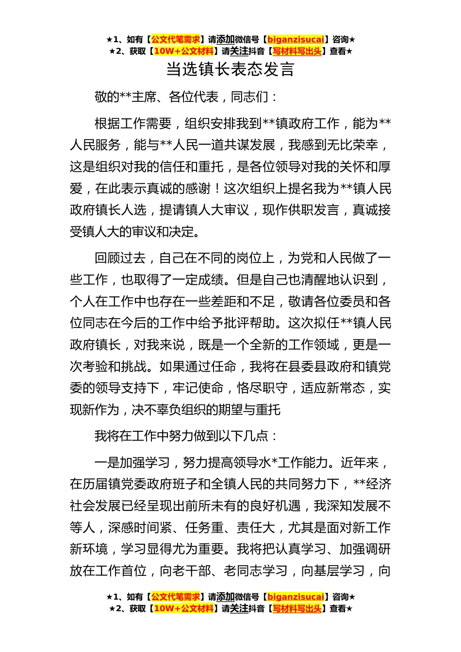 ★1、如有【公文代笔需求】请添加微信号【biganzisucai】咨询★★2、获取【10W+公文材料】请关注抖音【写材料写出头】查看★★1、如有【公文代笔需求】请添加微信号【biganzisucai】咨询★★2、获取【10W+公文材料】请关注抖音【写材料写出头】查看★★1、如有【公文代笔需求】请添加微信号【biganzisucai】咨询★★2、获取【10W+公文材料】请关注抖音【写材料写出头】查看★当选镇长表态发言敬的**主席、各位代表,同志们:根据工作需要,组织安排我到**镇政府工作,能为**人民服务,能与**人民一道共谋发展,我感到无比荣幸,这是组织对我的信任和重托,是各位领导对我的关怀和厚爱,在此表示真诚的感谢!这次组织上提名我为**镇人民政府镇长人选,提请镇人大审议,现作供职发言,真诚接受镇人大的审议和决定。...