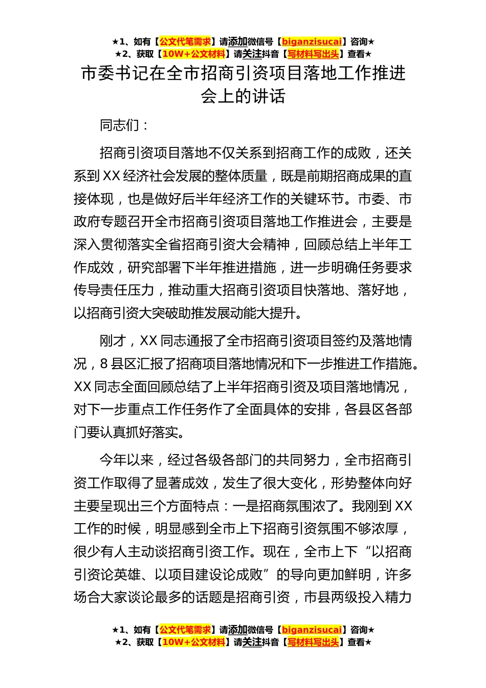 ★1、如有【公文代笔需求】请添加微信号【biganzisucai】咨询★★2、获取【10W+公文材料】请关注抖音【写材料写出头】查看★★1、如有【公文代笔需求】请添加微信号【biganzisucai】咨询★★2、获取【10W+公文材料】请关注抖音【写材料写出头】查看★★1、如有【公文代笔需求】请添加微信号【biganzisucai】咨询★★2、获取【10W+公文材料】请关注抖音【写材料写出头】查看★市委书记在全市招商引资项目落地工作推进会上的讲话同志们:招商引资项目落地不仅关系到招商工作的成败,还关系到XX经济社会发展的整体质量,既是前期招商成果的直接体现,也是做好后半年经济工作的关键环节。市委、市政府专题召开全市招商引资项目落地工作推进会,主要是深入贯彻落实全省招商引资大会精神,回顾总结上半年工作成效,研究...