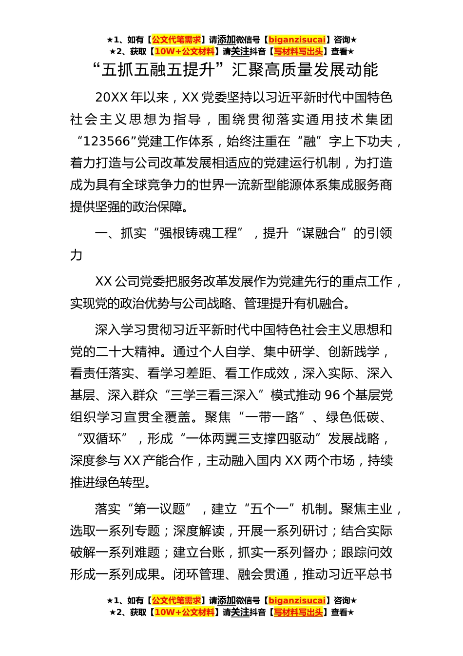 ★1、如有【公文代笔需求】请添加微信号【biganzisucai】咨询★★2、获取【10W+公文材料】请关注抖音【写材料写出头】查看★★1、如有【公文代笔需求】请添加微信号【biganzisucai】咨询★★2、获取【10W+公文材料】请关注抖音【写材料写出头】查看★★1、如有【公文代笔需求】请添加微信号【biganzisucai】咨询★★2、获取【10W+公文材料】请关注抖音【写材料写出头】查看★“五抓五融五提升”汇聚高质量发展动能20XX年以来,XX党委坚持以习近平新时代中国特色社会主义思想为指导,围绕贯彻落实通用技术集团“123566”党建工作体系,始终注重在“融”字上下功夫,着力打造与公司改革发展相适应的党建运行机制,为打造成为具有全球竞争力的世界一流新型能源体系集成服务商提供坚强的政治保障。一、抓实“强根铸魂...