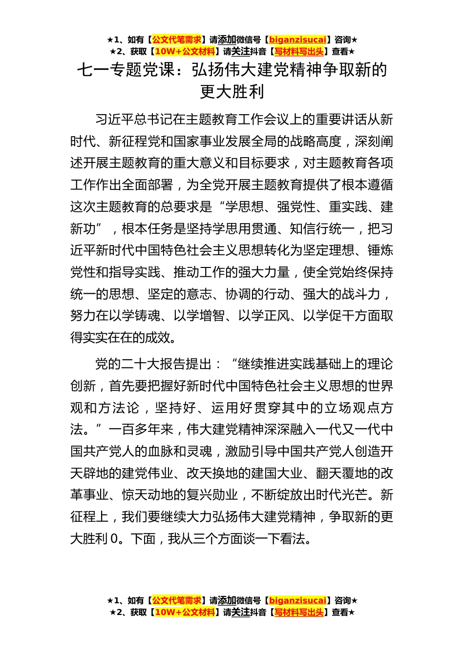 ★1、如有【公文代笔需求】请添加微信号【biganzisucai】咨询★★2、获取【10W+公文材料】请关注抖音【写材料写出头】查看★★1、如有【公文代笔需求】请添加微信号【biganzisucai】咨询★★2、获取【10W+公文材料】请关注抖音【写材料写出头】查看★★1、如有【公文代笔需求】请添加微信号【biganzisucai】咨询★★2、获取【10W+公文材料】请关注抖音【写材料写出头】查看★七一专题党课:弘扬伟大建党精神争取新的更大胜利习近平总书记在主题教育工作会议上的重要讲话从新时代、新征程党和国家事业发展全局的战略高度,深刻阐述开展主题教育的重大意义和目标要求,对主题教育各项工作作出全面部署,为全党开展主题教育提供了根本遵循这次主题教育的总要求是“学思想、强党性、重实践、建新功”,根本任务是坚持...