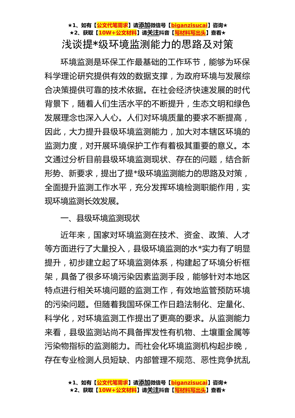 ★1、如有【公文代笔需求】请添加微信号【biganzisucai】咨询★★2、获取【10W+公文材料】请关注抖音【写材料写出头】查看★★1、如有【公文代笔需求】请添加微信号【biganzisucai】咨询★★2、获取【10W+公文材料】请关注抖音【写材料写出头】查看★★1、如有【公文代笔需求】请添加微信号【biganzisucai】咨询★★2、获取【10W+公文材料】请关注抖音【写材料写出头】查看★浅谈提*级环境监测能力的思路及对策环境监测是环保工作最基础的工作环节,能够为环保科学理论研究提供有效的数据支撑,为政府环境与发展综合决策提供可靠的技术依据。在社会经济快速发展的时代背景下,随着人们生活水平的不断提升,生态文明和绿色发展理念也深入人心。人们对环境质量的要求不断提高,因此,大力提升县级环境监测能力,加大...