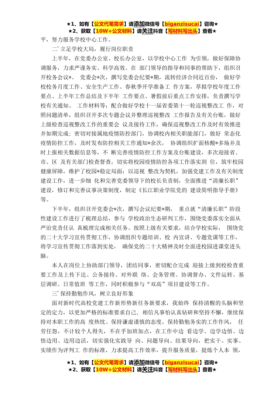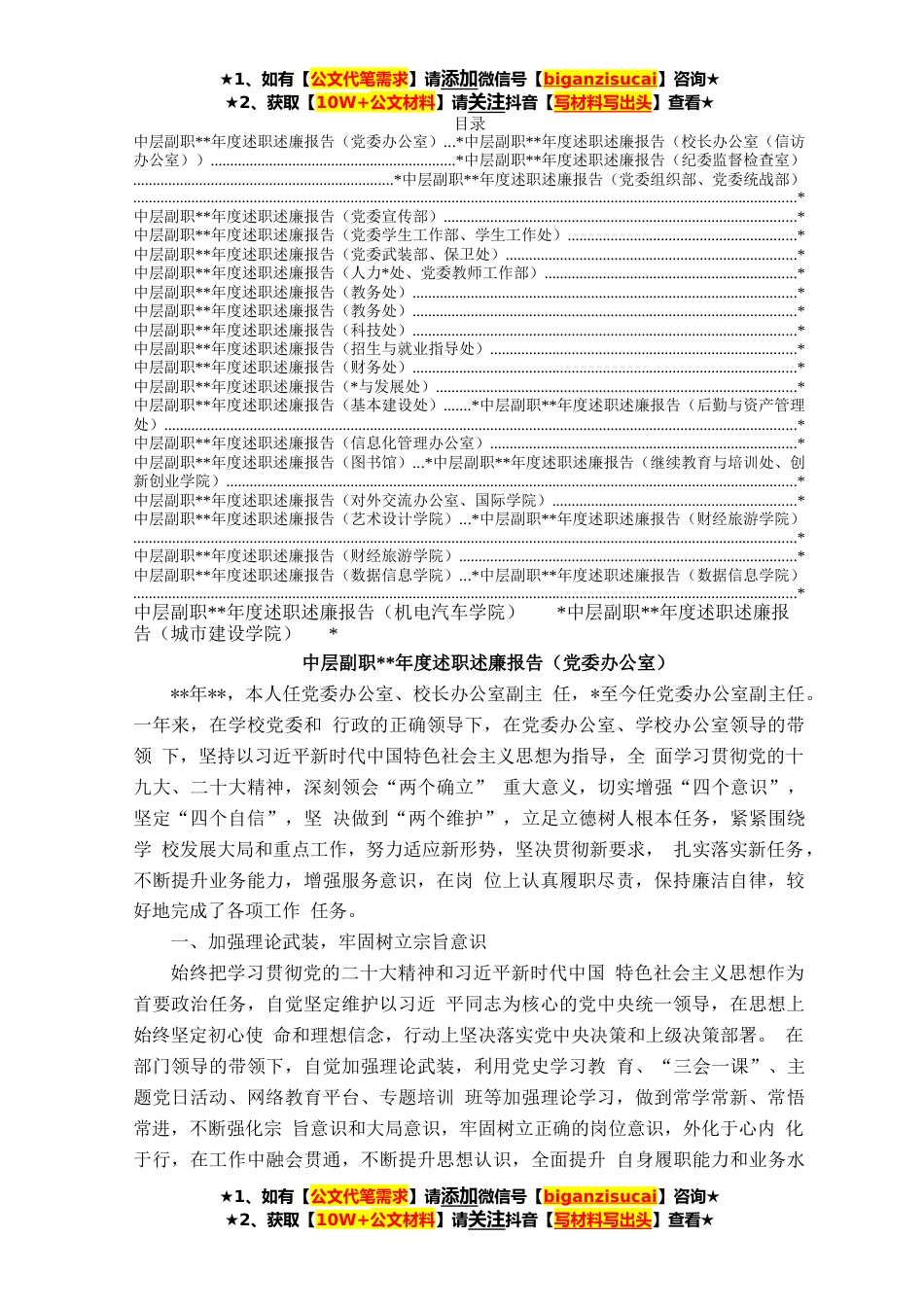 ★1、如有【公文代笔需求】请添加微信号【biganzisucai】咨询★★2、获取【10W+公文材料】请关注抖音【写材料写出头】查看★目录中层副职**年度述职述廉报告(党委办公室)...*中层副职**年度述职述廉报告(校长办公室(信访办公室))...............................................................*中层副职**年度述职述廉报告(纪委监督检查室)...................................................................*中层副职**年度述职述廉报告(党委组织部、党委统战部)...........................................................................................................................................................................*中层副职**年度述职述廉报告(党委宣传部)........