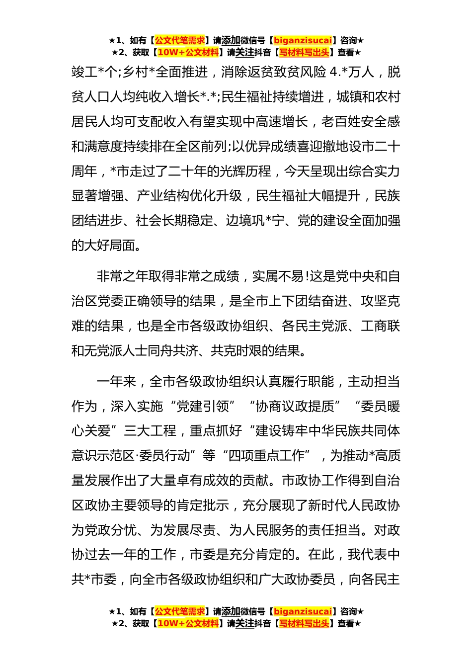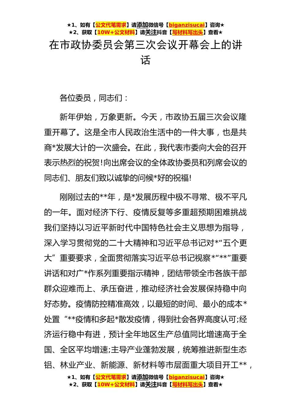 ★1、如有【公文代笔需求】请添加微信号【biganzisucai】咨询★★2、获取【10W+公文材料】请关注抖音【写材料写出头】查看★在市政协委员会第三次会议开幕会上的讲话各位委员,同志们:新年伊始,万象更新。今天,市政协五届三次会议隆重开幕了。这是全市人民政治生活中的一件大事,也是共商*发展大计的一次盛会。在此,我代表市委向大会的召开表示热烈的祝贺!向出席会议的全体政协委员和列席会议的同志们、朋友们致以诚挚的问候*好的祝福!刚刚过去的**年,是*发展历程中极不寻常、极不平凡的一年。面对经济下行、疫情反复等多重超预期困难挑战我们坚持以习近平新时代中国特色社会主义思想为指导,深入学习贯彻党的二十大精神和习近平总书记对*“五个更大”重要要求,全面贯彻落实习近平总书记视察*“**”重要讲话...