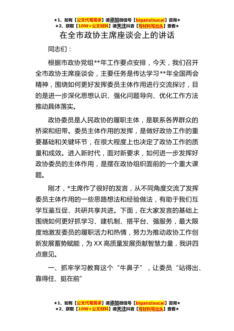★1、如有【公文代笔需求】请添加微信号【biganzisucai】咨询★★2、获取【10W+公文材料】请关注抖音【写材料写出头】查看★★1、如有【公文代笔需求】请添加微信号【biganzisucai】咨询★★2、获取【10W+公文材料】请关注抖音【写材料写出头】查看★★1、如有【公文代笔需求】请添加微信号【biganzisucai】咨询★★2、获取【10W+公文材料】请关注抖音【写材料写出头】查看★在全市政协主席座谈会上的讲话同志们:根据市政协党组**年工作要点安排,今天,我们召开全市政协主席座谈会,主要任务是传达学习**年全国两会精神,围绕如何更好发挥委员主体作用进行交流探讨,目的是进一步深化思想认识、强化问题导向、优化工作方法推动具体落实。政协委员是人民政协的履职主体,是联系各界群众的桥梁和纽带。委员主体作...