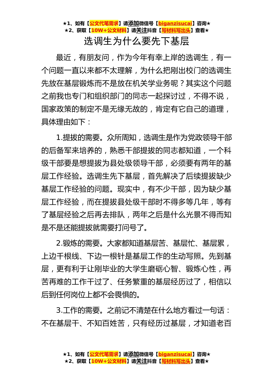 ★1、如有【公文代笔需求】请添加微信号【biganzisucai】咨询★★2、获取【10W+公文材料】请关注抖音【写材料写出头】查看★★1、如有【公文代笔需求】请添加微信号【biganzisucai】咨询★★2、获取【10W+公文材料】请关注抖音【写材料写出头】查看★★1、如有【公文代笔需求】请添加微信号【biganzisucai】咨询★★2、获取【10W+公文材料】请关注抖音【写材料写出头】查看★选调生为什么要先下基层最近,有朋友问,作为今年有幸上岸的选调生,有一个问题一直以来都不太理解,为什么把刚出校门的选调生先放在基层锻炼而不是放在机关学业务呢?其实这个问题之前我也专门和组织部门的同志一起探讨过,不得不说,国家政策的制定不是无缘无故的,肯定有它自己的道理,具体理由如下:1.提拔的需要。众所周知,选调生是...
