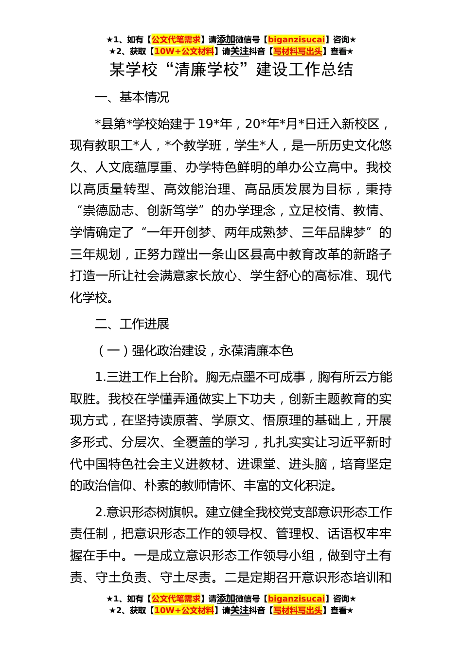 ★1、如有【公文代笔需求】请添加微信号【biganzisucai】咨询★★2、获取【10W+公文材料】请关注抖音【写材料写出头】查看★★1、如有【公文代笔需求】请添加微信号【biganzisucai】咨询★★2、获取【10W+公文材料】请关注抖音【写材料写出头】查看★★1、如有【公文代笔需求】请添加微信号【biganzisucai】咨询★★2、获取【10W+公文材料】请关注抖音【写材料写出头】查看★某学校“清廉学校”建设工作总结一、基本情况*县第*学校始建于19*年,20*年*月*日迁入新校区,现有教职工*人,*个教学班,学生*人,是一所历史文化悠久、人文底蕴厚重、办学特色鲜明的单办公立高中。我校以高质量转型、高效能治理、高品质发展为目标,秉持“崇德励志、创新笃学”的办学理念,立足校情、教情、学情确定了“一年开创梦、两年...