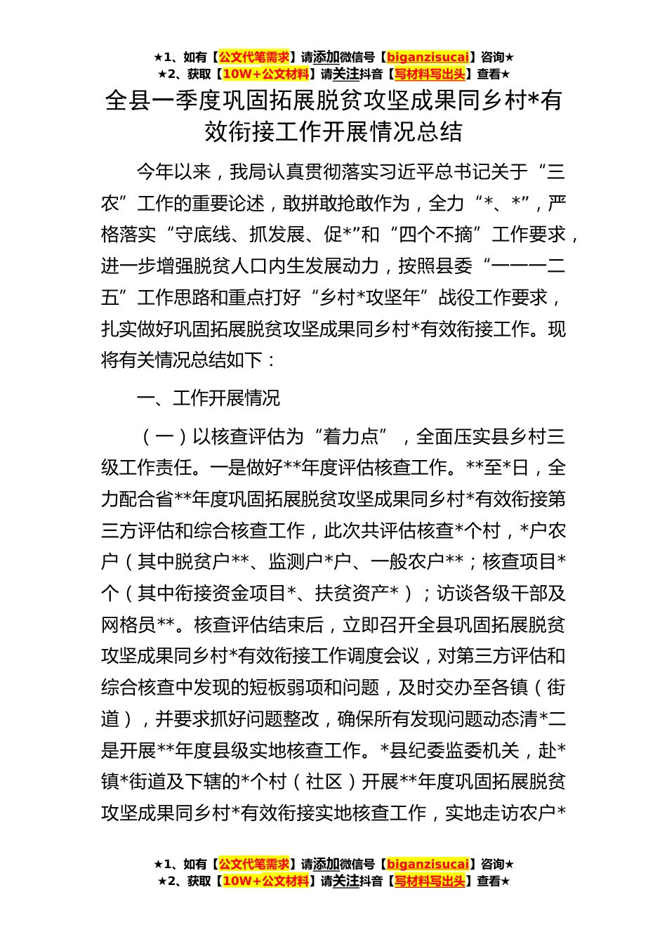★1、如有【公文代笔需求】请添加微信号【biganzisucai】咨询★★2、获取【10W+公文材料】请关注抖音【写材料写出头】查看★★1、如有【公文代笔需求】请添加微信号【biganzisucai】咨询★★2、获取【10W+公文材料】请关注抖音【写材料写出头】查看★★1、如有【公文代笔需求】请添加微信号【biganzisucai】咨询★★2、获取【10W+公文材料】请关注抖音【写材料写出头】查看★全县一季度巩固拓展脱贫攻坚成果同乡村*有效衔接工作开展情况总结今年以来,我局认真贯彻落实习近平总书记关于“三农”工作的重要论述,敢拼敢抢敢作为,全力“*、*”,严格落实“守底线、抓发展、促*”和“四个不摘”工作要求,进一步增强脱贫人口内生发展动力,按照县委“一一一二五”工作思路和重点打好“乡村*攻坚年”战役工作要求,扎...