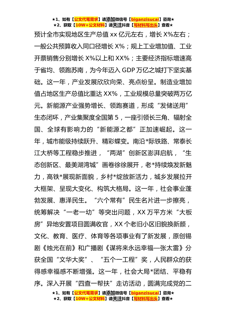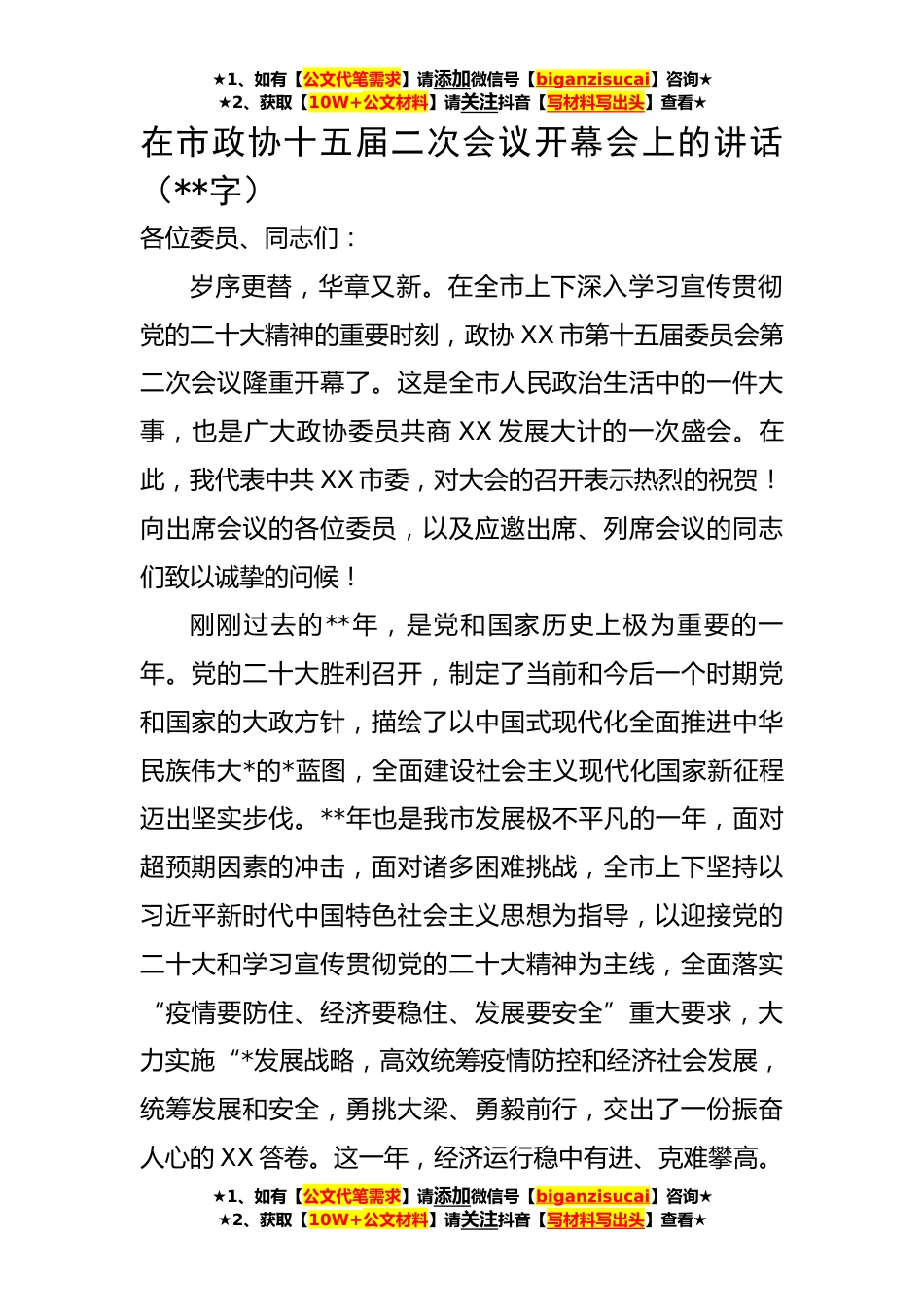 ★1、如有【公文代笔需求】请添加微信号【biganzisucai】咨询★★2、获取【10W+公文材料】请关注抖音【写材料写出头】查看★在市政协十五届二次会议开幕会上的讲话(**字)各位委员、同志们:岁序更替,华章又新。在全市上下深入学习宣传贯彻党的二十大精神的重要时刻,政协XX市第十五届委员会第二次会议隆重开幕了。这是全市人民政治生活中的一件大事,也是广大政协委员共商XX发展大计的一次盛会。在此,我代表中共XX市委,对大会的召开表示热烈的祝贺!向出席会议的各位委员,以及应邀出席、列席会议的同志们致以诚挚的问候!刚刚过去的**年,是党和国家历史上极为重要的一年。党的二十大胜利召开,制定了当前和今后一个时期党和国家的大政方针,描绘了以中国式现代化全面推进中华民族伟大*的*蓝图,全面建设社...