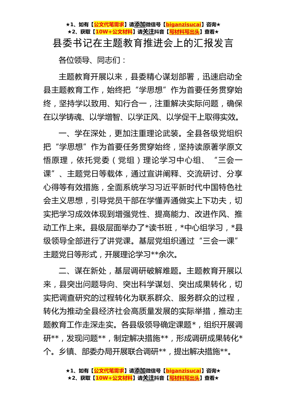 ★1、如有【公文代笔需求】请添加微信号【biganzisucai】咨询★★2、获取【10W+公文材料】请关注抖音【写材料写出头】查看★★1、如有【公文代笔需求】请添加微信号【biganzisucai】咨询★★2、获取【10W+公文材料】请关注抖音【写材料写出头】查看★★1、如有【公文代笔需求】请添加微信号【biganzisucai】咨询★★2、获取【10W+公文材料】请关注抖音【写材料写出头】查看★县委书记在主题教育推进会上的汇报发言各位领导、同志们:主题教育开展以来,县委精心谋划部署,迅速启动全县主题教育工作,始终把“学思想”作为首要任务贯穿始终,坚持学以致用、知行合一,注重解决实际问题,确保在以学铸魂、以学增智、以学正风、以学促干上取得实效。一、学在深处,更加注重理论武装。全县各级党组织把“学思想”作为...