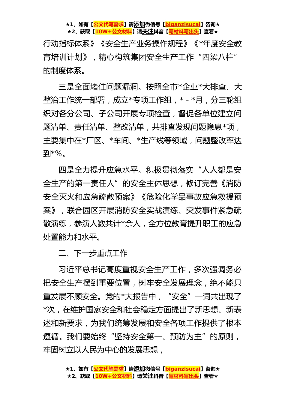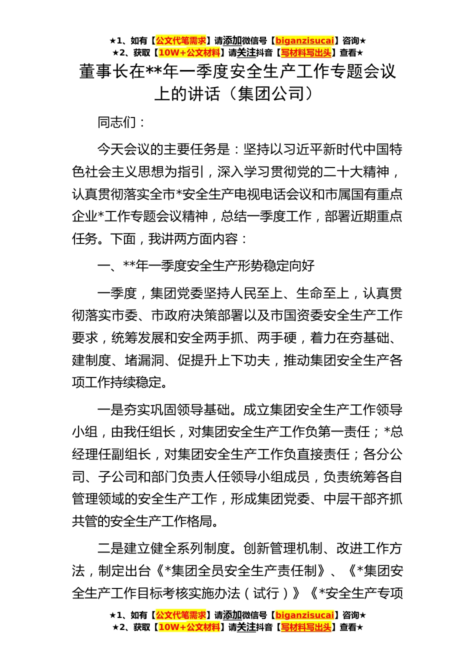 ★1、如有【公文代笔需求】请添加微信号【biganzisucai】咨询★★2、获取【10W+公文材料】请关注抖音【写材料写出头】查看★董事长在**年一季度安全生产工作专题会议上的讲话(集团公司)同志们:今天会议的主要任务是:坚持以习近平新时代中国特色社会主义思想为指引,深入学习贯彻党的二十大精神,认真贯彻落实全市*安全生产电视电话会议和市属国有重点企业*工作专题会议精神,总结一季度工作,部署近期重点任务。下面,我讲两方面内容:一、**年一季度安全生产形势稳定向好一季度,集团党委坚持人民至上、生命至上,认真贯彻落实市委、市政府决策部署以及市国资委安全生产工作要求,统筹发展和安全两手抓、两手硬,着力在夯基础、建制度、堵漏洞、促提升上下功夫,推动集团安全生产各项工作持续稳定。一是夯实...