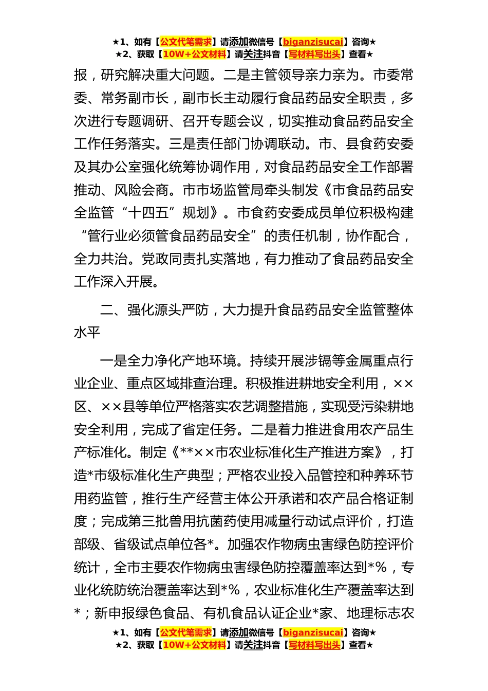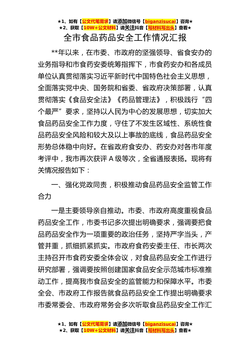 ★1、如有【公文代笔需求】请添加微信号【biganzisucai】咨询★★2、获取【10W+公文材料】请关注抖音【写材料写出头】查看★全市食品药品安全工作情况汇报**年以来,在市委、市政府的坚强领导、省食安办的业务指导和市食药安委统筹指挥下,市食药安办和各成员单位认真贯彻落实习近平新时代中国特色社会主义思想,全面落实党中央、国务院和省委、省政府决策部署,认真贯彻落实《食品安全法》《药品管理法》,积极践行“四个最严”要求,坚持以人民为中心的发展思想,切实加大食品药品安全工作力度,守住了不发生区域性、系统性食品药品安全风险和较大及以上事故的底线,食品药品安全形势总体稳中向好。在省政府食安办、药安办对各市年度考评中,我市再次获评A级等次,全省通报表扬。现将有关情况报告如下:一、强化...