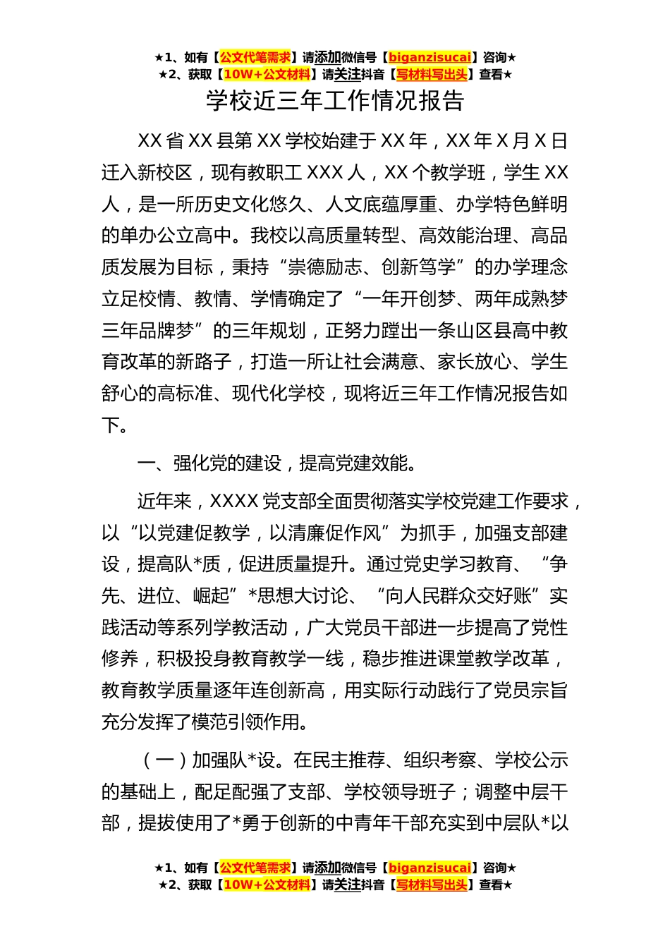 ★1、如有【公文代笔需求】请添加微信号【biganzisucai】咨询★★2、获取【10W+公文材料】请关注抖音【写材料写出头】查看★★1、如有【公文代笔需求】请添加微信号【biganzisucai】咨询★★2、获取【10W+公文材料】请关注抖音【写材料写出头】查看★★1、如有【公文代笔需求】请添加微信号【biganzisucai】咨询★★2、获取【10W+公文材料】请关注抖音【写材料写出头】查看★学校近三年工作情况报告XX省XX县第XX学校始建于XX年,XX年X月X日迁入新校区,现有教职工XXX人,XX个教学班,学生XX人,是一所历史文化悠久、人文底蕴厚重、办学特色鲜明的单办公立高中。我校以高质量转型、高效能治理、高品质发展为目标,秉持“崇德励志、创新笃学”的办学理念立足校情、教情、学情确定了“一年开创梦、两年成熟梦三年品牌...