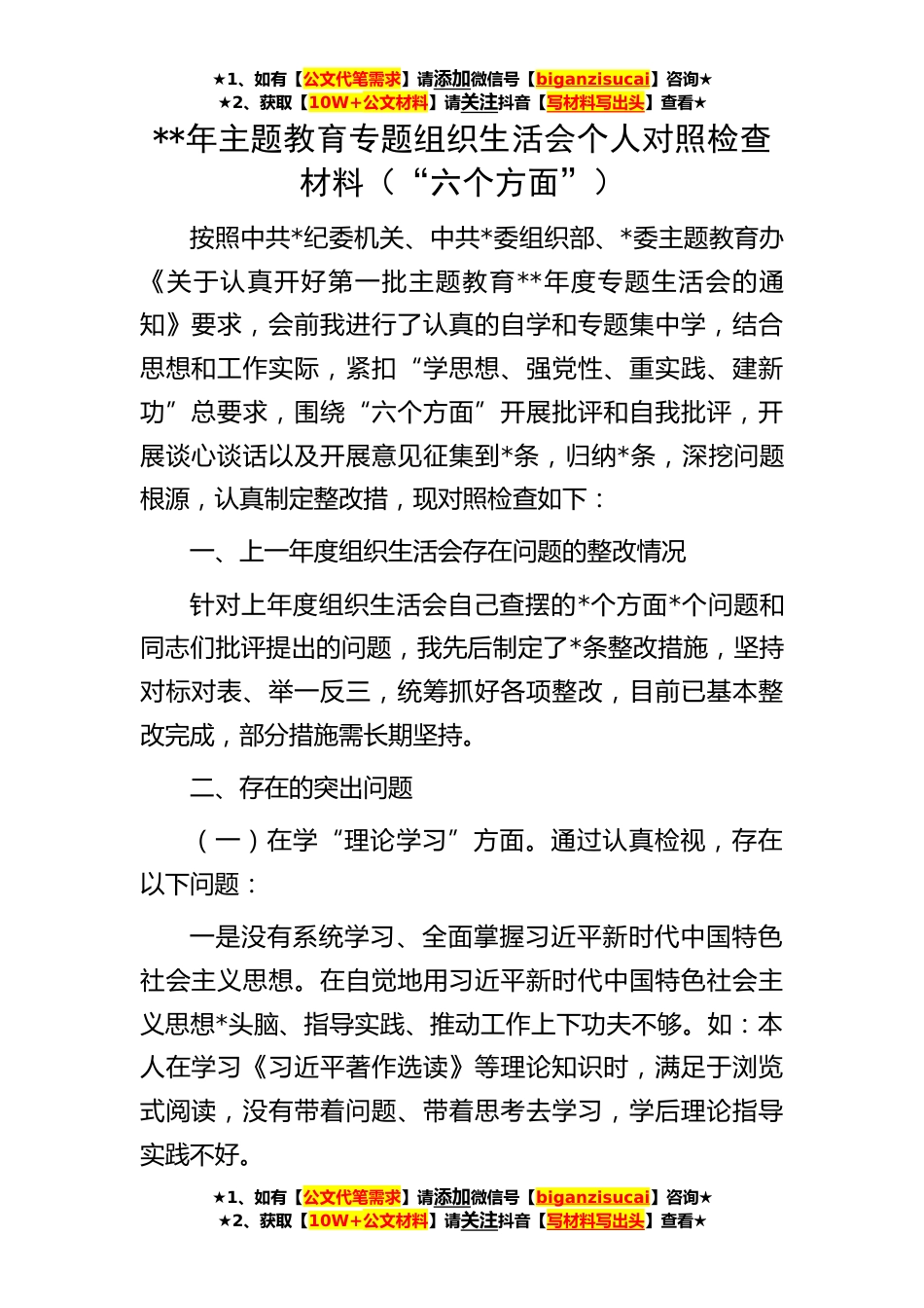 ★1、如有【公文代笔需求】请添加微信号【biganzisucai】咨询★★2、获取【10W+公文材料】请关注抖音【写材料写出头】查看★★1、如有【公文代笔需求】请添加微信号【biganzisucai】咨询★★2、获取【10W+公文材料】请关注抖音【写材料写出头】查看★★1、如有【公文代笔需求】请添加微信号【biganzisucai】咨询★★2、获取【10W+公文材料】请关注抖音【写材料写出头】查看★**年主题教育专题组织生活会个人对照检查材料(“六个方面”)按照中共*纪委机关、中共*委组织部、*委主题教育办《关于认真开好第一批主题教育**年度专题生活会的通知》要求,会前我进行了认真的自学和专题集中学,结合思想和工作实际,紧扣“学思想、强党性、重实践、建新功”总要求,围绕“六个方面”开展批评和自我批评,开展谈心谈话以...