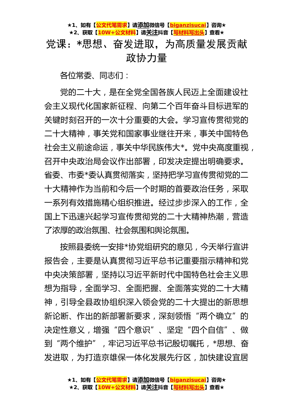★1、如有【公文代笔需求】请添加微信号【biganzisucai】咨询★★2、获取【10W+公文材料】请关注抖音【写材料写出头】查看★★1、如有【公文代笔需求】请添加微信号【biganzisucai】咨询★★2、获取【10W+公文材料】请关注抖音【写材料写出头】查看★★1、如有【公文代笔需求】请添加微信号【biganzisucai】咨询★★2、获取【10W+公文材料】请关注抖音【写材料写出头】查看★党课:*思想、奋发进取,为高质量发展贡献政协力量各位常委、同志们:党的二十大,是在全党全国各族人民迈上全面建设社会主义现代化国家新征程、向第二个百年奋斗目标进军的关键时刻召开的一次十分重要的大会。学习宣传贯彻党的二十大精神,事关党和国家事业继往开来,事关中国特色社会主义前途命运,事关中华民族伟大*。党中央高度重视,...