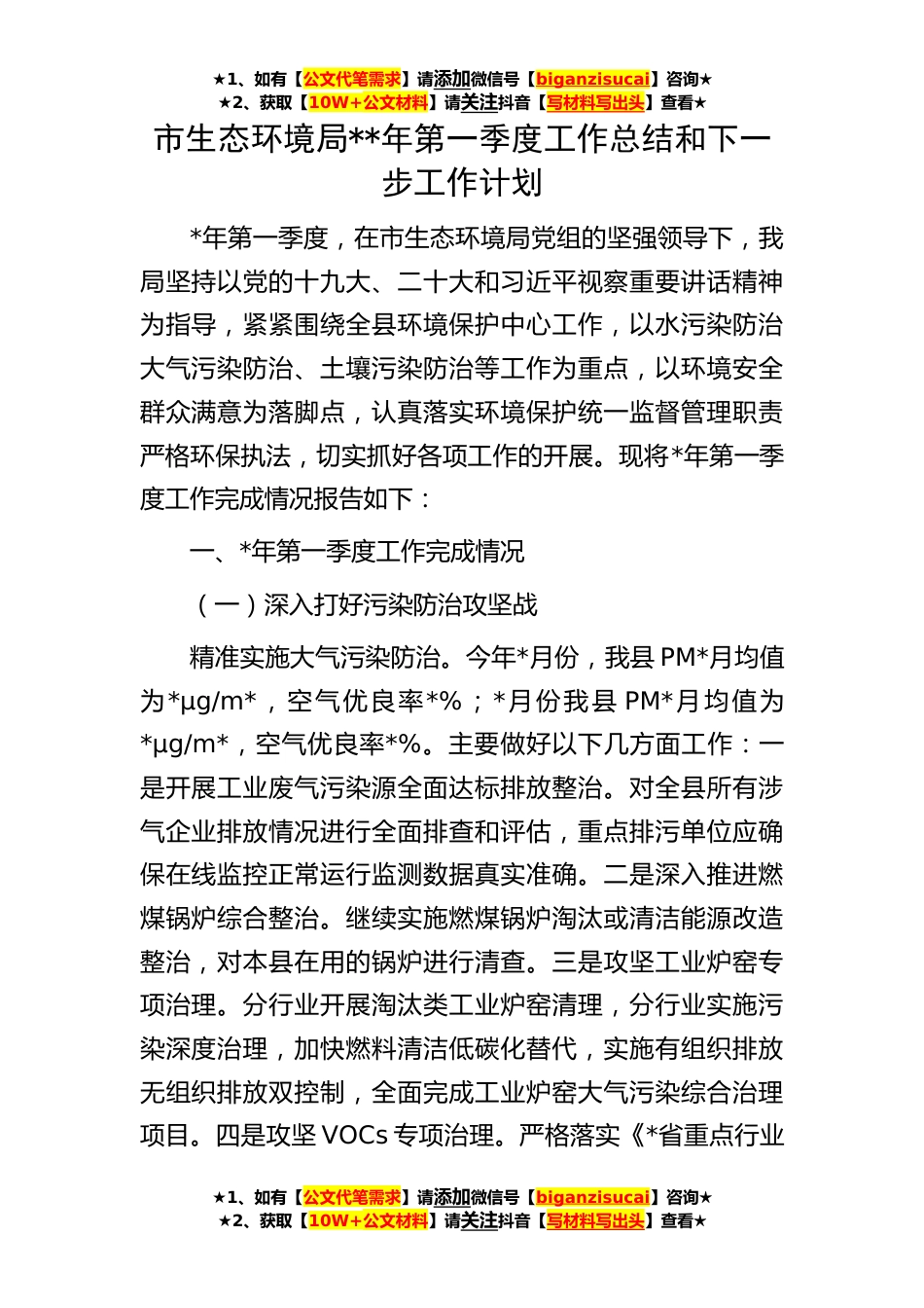 ★1、如有【公文代笔需求】请添加微信号【biganzisucai】咨询★★2、获取【10W+公文材料】请关注抖音【写材料写出头】查看★★1、如有【公文代笔需求】请添加微信号【biganzisucai】咨询★★2、获取【10W+公文材料】请关注抖音【写材料写出头】查看★★1、如有【公文代笔需求】请添加微信号【biganzisucai】咨询★★2、获取【10W+公文材料】请关注抖音【写材料写出头】查看★市生态环境局**年第一季度工作总结和下一步工作计划*年第一季度,在市生态环境局党组的坚强领导下,我局坚持以党的十九大、二十大和习近平视察重要讲话精神为指导,紧紧围绕全县环境保护中心工作,以水污染防治大气污染防治、土壤污染防治等工作为重点,以环境安全群众满意为落脚点,认真落实环境保护统一监督管理职责严格环保执法,切实抓...