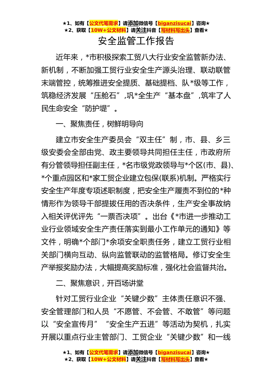 ★1、如有【公文代笔需求】请添加微信号【biganzisucai】咨询★★2、获取【10W+公文材料】请关注抖音【写材料写出头】查看★★1、如有【公文代笔需求】请添加微信号【biganzisucai】咨询★★2、获取【10W+公文材料】请关注抖音【写材料写出头】查看★★1、如有【公文代笔需求】请添加微信号【biganzisucai】咨询★★2、获取【10W+公文材料】请关注抖音【写材料写出头】查看★安全监管工作报告近年来,*市积极探索工贸八大行业安全监管新办法、新机制,不断加强工贸行业安全生产源头治理、联动联管末端管控,统筹推进安全提质、基础提档、队*级等工作,筑稳经济发展“压舱石”,巩*全生产“基本盘”,筑牢了人民生命安全“防护堤”。一、聚焦责任,树鲜明导向建立市安全生产委员会“双主任”制,市、县、乡三级安委会...