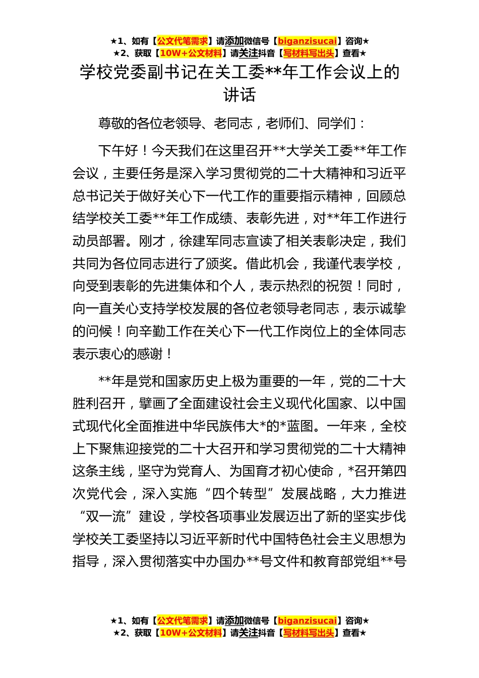 ★1、如有【公文代笔需求】请添加微信号【biganzisucai】咨询★★2、获取【10W+公文材料】请关注抖音【写材料写出头】查看★★1、如有【公文代笔需求】请添加微信号【biganzisucai】咨询★★2、获取【10W+公文材料】请关注抖音【写材料写出头】查看★★1、如有【公文代笔需求】请添加微信号【biganzisucai】咨询★★2、获取【10W+公文材料】请关注抖音【写材料写出头】查看★学校党委副书记在关工委**年工作会议上的讲话尊敬的各位老领导、老同志,老师们、同学们:下午好!今天我们在这里召开**大学关工委**年工作会议,主要任务是深入学习贯彻党的二十大精神和习近平总书记关于做好关心下一代工作的重要指示精神,回顾总结学校关工委**年工作成绩、表彰先进,对**年工作进行动员部署。刚才,徐建军同志宣读了相...