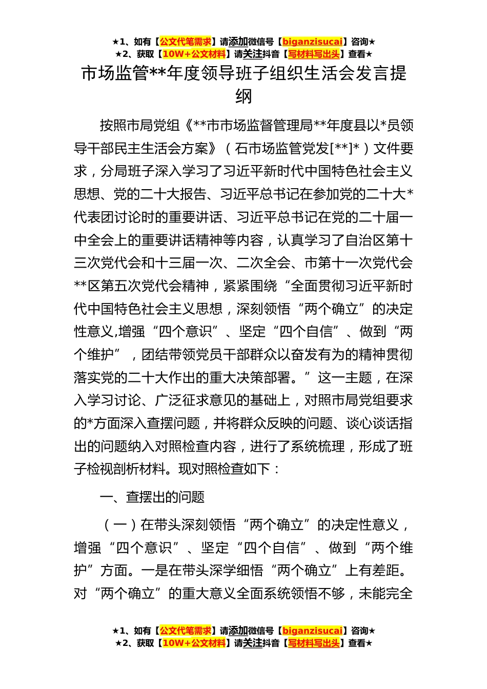 ★1、如有【公文代笔需求】请添加微信号【biganzisucai】咨询★★2、获取【10W+公文材料】请关注抖音【写材料写出头】查看★★1、如有【公文代笔需求】请添加微信号【biganzisucai】咨询★★2、获取【10W+公文材料】请关注抖音【写材料写出头】查看★★1、如有【公文代笔需求】请添加微信号【biganzisucai】咨询★★2、获取【10W+公文材料】请关注抖音【写材料写出头】查看★市场监管**年度领导班子组织生活会发言提纲按照市局党组《**市市场监督管理局**年度县以*员领导干部民主生活会方案》(石市场监管党发[**]*)文件要求,分局班子深入学习了习近平新时代中国特色社会主义思想、党的二十大报告、习近平总书记在参加党的二十大*代表团讨论时的重要讲话、习近平总书记在党的二十届一中全会上的重要讲话精神等内...