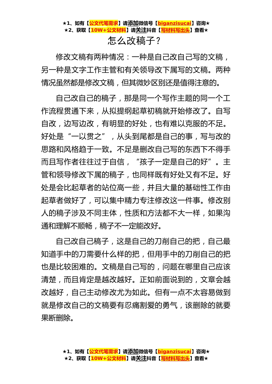 ★1、如有【公文代笔需求】请添加微信号【biganzisucai】咨询★★2、获取【10W+公文材料】请关注抖音【写材料写出头】查看★★1、如有【公文代笔需求】请添加微信号【biganzisucai】咨询★★2、获取【10W+公文材料】请关注抖音【写材料写出头】查看★★1、如有【公文代笔需求】请添加微信号【biganzisucai】咨询★★2、获取【10W+公文材料】请关注抖音【写材料写出头】查看★怎么改稿子?修改文稿有两种情况:一种是自己改自己写的文稿,另一种是文字工作主管和有关领导改下属写的文稿。两种情况虽然都是修改文稿,但其微妙区别还是值得注意的。自己改自己的稿子,那是同一个写作主题的同一个工作流程贯通下来,从拟提纲起草初稿就开始修改了。自写自改,边写边改,有明显的好处,也有难以克服的不足。好处是“一...