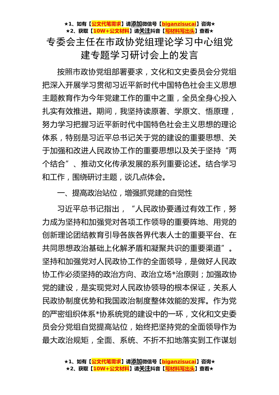 ★1、如有【公文代笔需求】请添加微信号【biganzisucai】咨询★★2、获取【10W+公文材料】请关注抖音【写材料写出头】查看★★1、如有【公文代笔需求】请添加微信号【biganzisucai】咨询★★2、获取【10W+公文材料】请关注抖音【写材料写出头】查看★★1、如有【公文代笔需求】请添加微信号【biganzisucai】咨询★★2、获取【10W+公文材料】请关注抖音【写材料写出头】查看★专委会主任在市政协党组理论学习中心组党建专题学习研讨会上的发言按照市政协党组部署要求,文化和文史委员会分党组把深入开展学习贯彻习近平新时代中国特色社会主义思想主题教育作为今年党建工作的重中之重,全员全身心投入扎实有效推进。期间,我坚持读原著、学原文、悟原理,努力学习把握习近平新时代中国特色社会主义思想的理论体系,...