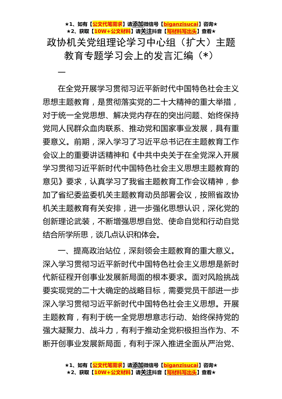 ★1、如有【公文代笔需求】请添加微信号【biganzisucai】咨询★★2、获取【10W+公文材料】请关注抖音【写材料写出头】查看★★1、如有【公文代笔需求】请添加微信号【biganzisucai】咨询★★2、获取【10W+公文材料】请关注抖音【写材料写出头】查看★★1、如有【公文代笔需求】请添加微信号【biganzisucai】咨询★★2、获取【10W+公文材料】请关注抖音【写材料写出头】查看★政协机关党组理论学习中心组(扩大)主题教育专题学习会上的发言汇编(*)一在全党开展学习贯彻习近平新时代中国特色社会主义思想主题教育,是贯彻落实党的二十大精神的重大举措,对于统一全党思想、解决党内存在的突出问题、始终保持党同人民群众血肉联系、推动党和国家事业发展,具有重要意义。前期,深入学习了习近平总书记在主题教育工...