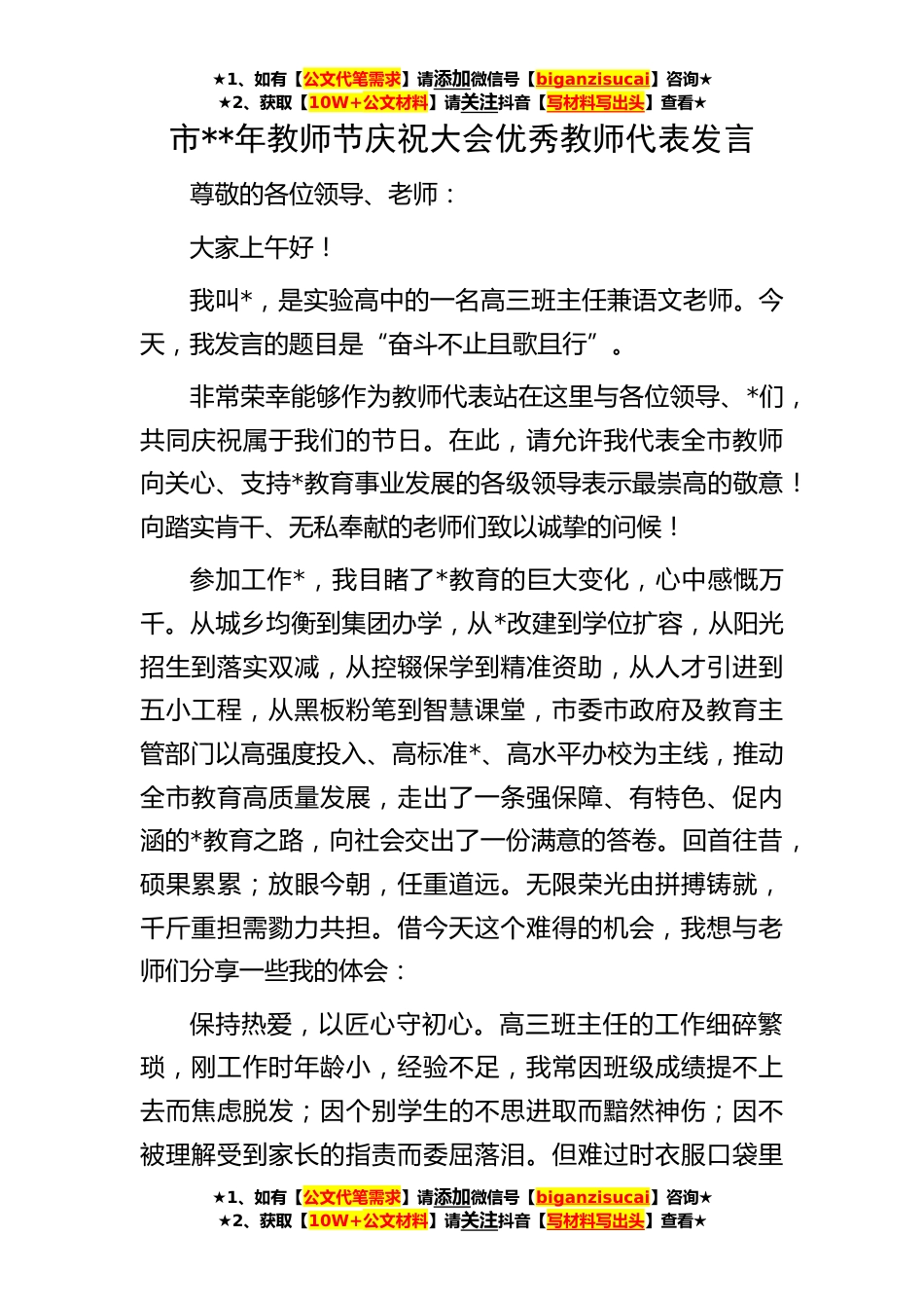 ★1、如有【公文代笔需求】请添加微信号【biganzisucai】咨询★★2、获取【10W+公文材料】请关注抖音【写材料写出头】查看★★1、如有【公文代笔需求】请添加微信号【biganzisucai】咨询★★2、获取【10W+公文材料】请关注抖音【写材料写出头】查看★★1、如有【公文代笔需求】请添加微信号【biganzisucai】咨询★★2、获取【10W+公文材料】请关注抖音【写材料写出头】查看★市**年教师节庆祝大会优秀教师代表发言尊敬的各位领导、老师:大家上午好!我叫*,是实验高中的一名高三班主任兼语文老师。今天,我发言的题目是“奋斗不止且歌且行”。非常荣幸能够作为教师代表站在这里与各位领导、*们,共同庆祝属于我们的节日。在此,请允许我代表全市教师向关心、支持*教育事业发展的各级领导表示最崇高的敬意!向踏实...
