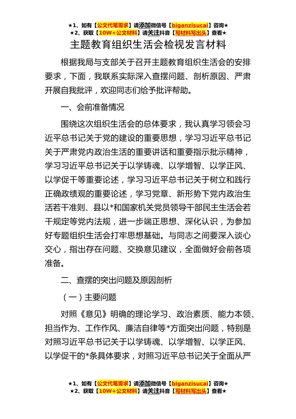 ★1、如有【公文代笔需求】请添加微信号【biganzisucai】咨询★★2、获取【10W+公文材料】请关注抖音【写材料写出头】查看★★1、如有【公文代笔需求】请添加微信号【biganzisucai】咨询★★2、获取【10W+公文材料】请关注抖音【写材料写出头】查看★★1、如有【公文代笔需求】请添加微信号【biganzisucai】咨询★★2、获取【10W+公文材料】请关注抖音【写材料写出头】查看★主题教育组织生活会检视发言材料根据我局与支部关于召开主题教育组织生活会的安排要求,下面,我联系实际深入查摆问题、剖析原因、严肃开展自我批评,欢迎同志们给予批评帮助。一、会前准备情况围绕这次组织生活会的总体要求,我认真学习领会习近平总书记关于党的建设的重要思想,学习习近平总书记关于严肃党内政治生活的重要讲话和重要指...