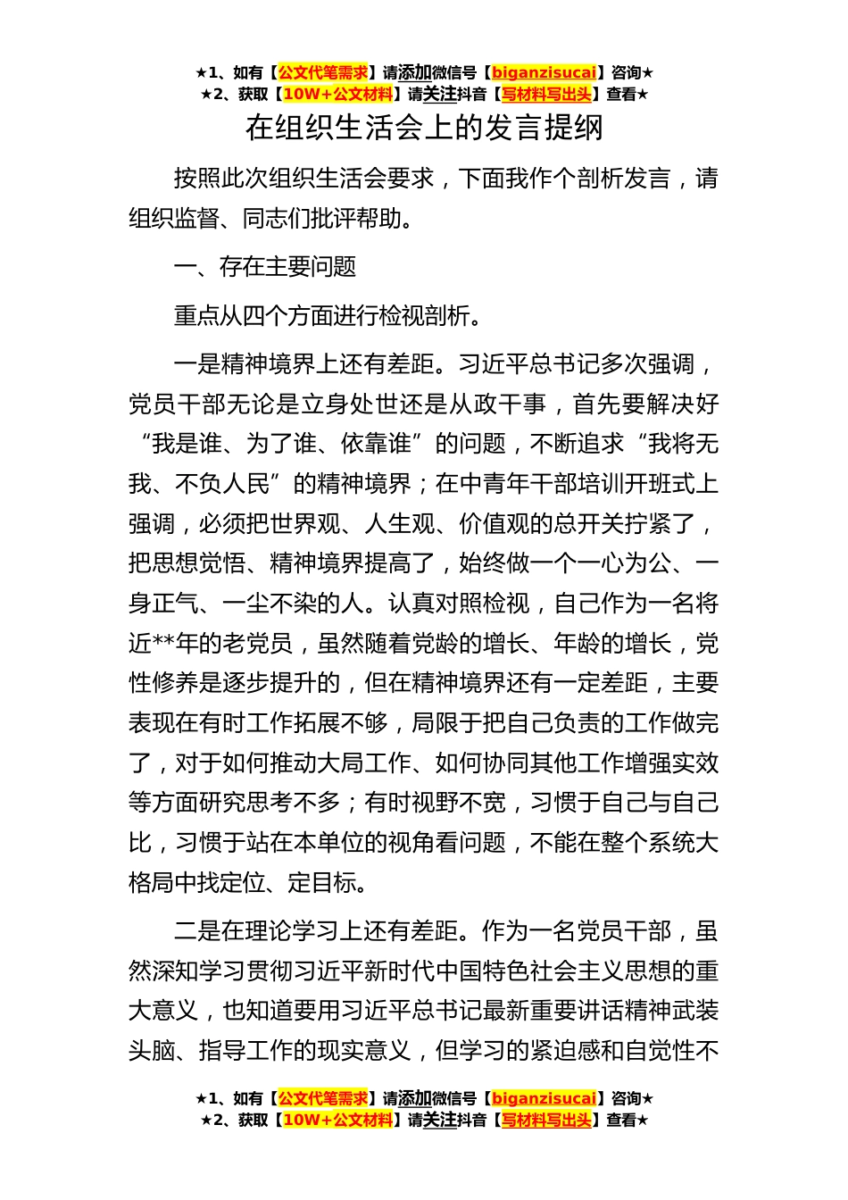 ★1、如有【公文代笔需求】请添加微信号【biganzisucai】咨询★★2、获取【10W+公文材料】请关注抖音【写材料写出头】查看★★1、如有【公文代笔需求】请添加微信号【biganzisucai】咨询★★2、获取【10W+公文材料】请关注抖音【写材料写出头】查看★★1、如有【公文代笔需求】请添加微信号【biganzisucai】咨询★★2、获取【10W+公文材料】请关注抖音【写材料写出头】查看★在组织生活会上的发言提纲按照此次组织生活会要求,下面我作个剖析发言,请组织监督、同志们批评帮助。一、存在主要问题重点从四个方面进行检视剖析。一是精神境界上还有差距。习近平总书记多次强调,党员干部无论是立身处世还是从政干事,首先要解决好“我是谁、为了谁、依靠谁”的问题,不断追求“我将无我、不负人民”的精神境界;在中...