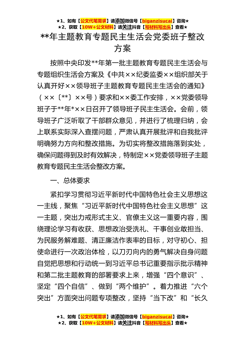 ★1、如有【公文代笔需求】请添加微信号【biganzisucai】咨询★★2、获取【10W+公文材料】请关注抖音【写材料写出头】查看★★1、如有【公文代笔需求】请添加微信号【biganzisucai】咨询★★2、获取【10W+公文材料】请关注抖音【写材料写出头】查看★★1、如有【公文代笔需求】请添加微信号【biganzisucai】咨询★★2、获取【10W+公文材料】请关注抖音【写材料写出头】查看★**年主题教育专题民主生活会党委班子整改方案按照中央印发**年第一批主题教育专题民主生活会与专题组织生活会方案及《中共××纪委监委××组织部关于认真开好××领导班子主题教育专题民主生活会的通知》(××〔**〕××号)要求和××委工作安排,××党委领导班子于**年*××日召开了领导班子民主生活会。会前,领导班子广泛听取了干部...