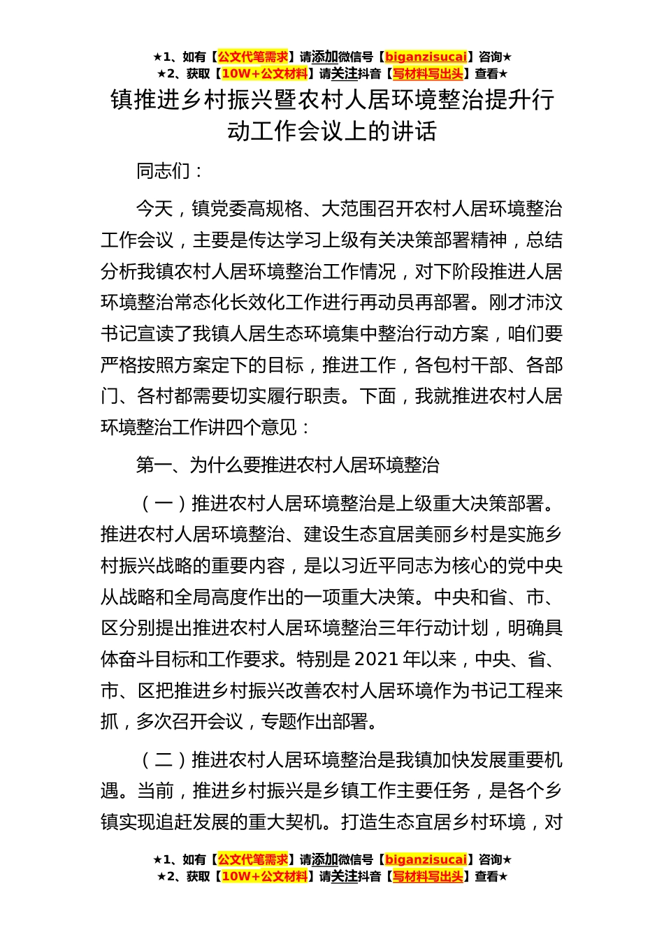 ★1、如有【公文代笔需求】请添加微信号【biganzisucai】咨询★★2、获取【10W+公文材料】请关注抖音【写材料写出头】查看★★1、如有【公文代笔需求】请添加微信号【biganzisucai】咨询★★2、获取【10W+公文材料】请关注抖音【写材料写出头】查看★★1、如有【公文代笔需求】请添加微信号【biganzisucai】咨询★★2、获取【10W+公文材料】请关注抖音【写材料写出头】查看★镇推进乡村振兴暨农村人居环境整治提升行动工作会议上的讲话同志们:今天,镇党委高规格、大范围召开农村人居环境整治工作会议,主要是传达学习上级有关决策部署精神,总结分析我镇农村人居环境整治工作情况,对下阶段推进人居环境整治常态化长效化工作进行再动员再部署。刚才沛汶书记宣读了我镇人居生态环境集中整治行动方案,咱们要严格...