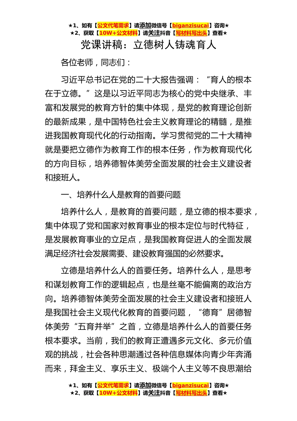 ★1、如有【公文代笔需求】请添加微信号【biganzisucai】咨询★★2、获取【10W+公文材料】请关注抖音【写材料写出头】查看★★1、如有【公文代笔需求】请添加微信号【biganzisucai】咨询★★2、获取【10W+公文材料】请关注抖音【写材料写出头】查看★★1、如有【公文代笔需求】请添加微信号【biganzisucai】咨询★★2、获取【10W+公文材料】请关注抖音【写材料写出头】查看★党课讲稿:立德树人铸魂育人各位老师,同志们:习近平总书记在党的二十大报告强调:“育人的根本在于立德。”这是以习近平同志为核心的党中央继承、丰富和发展党的教育方针的集中体现,是党的教育理论创新的最新成果,是中国特色社会主义教育理论的精髓,是推进我国教育现代化的行动指南。学习贯彻党的二十大精神就是要把立德作为教育工作...