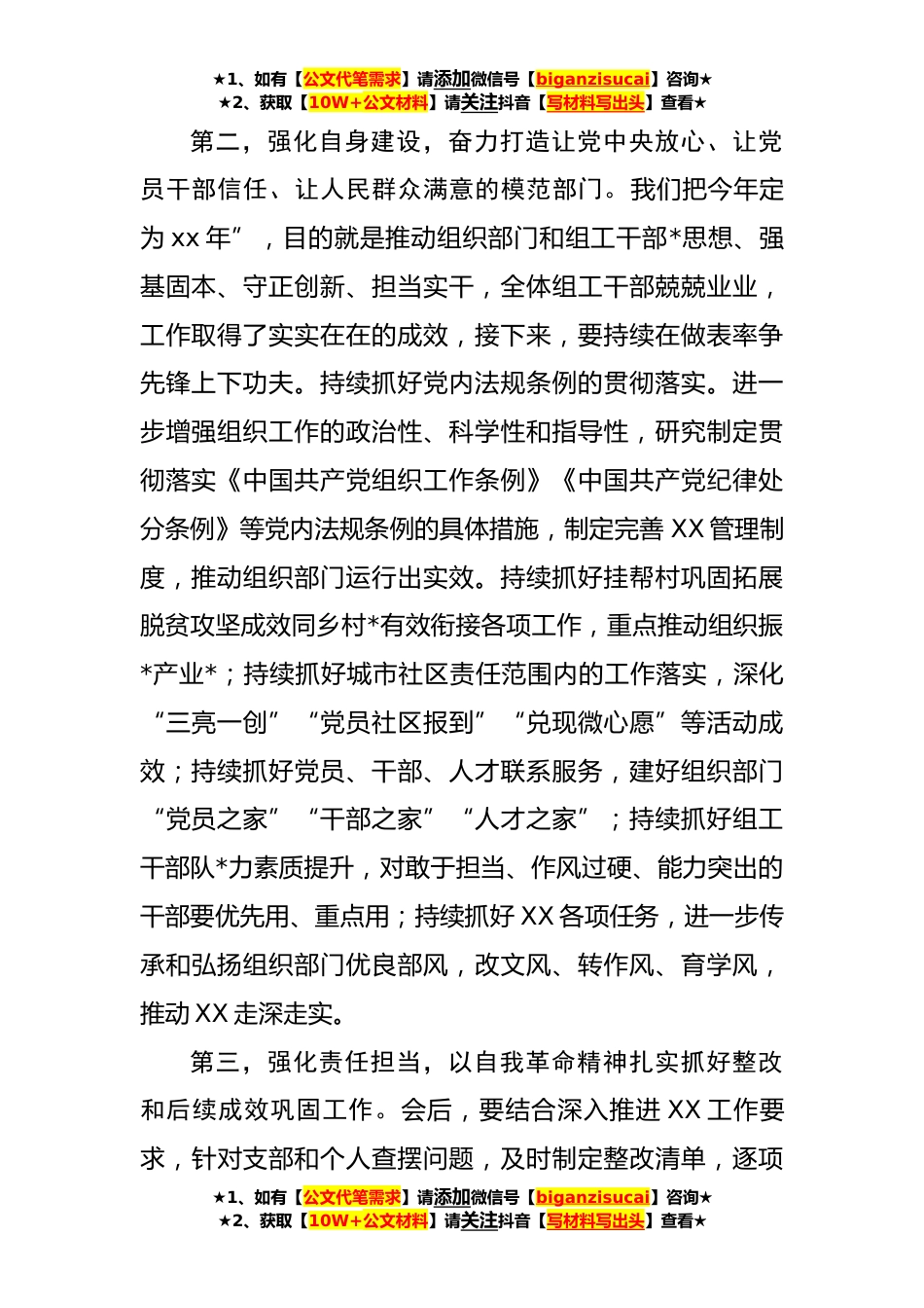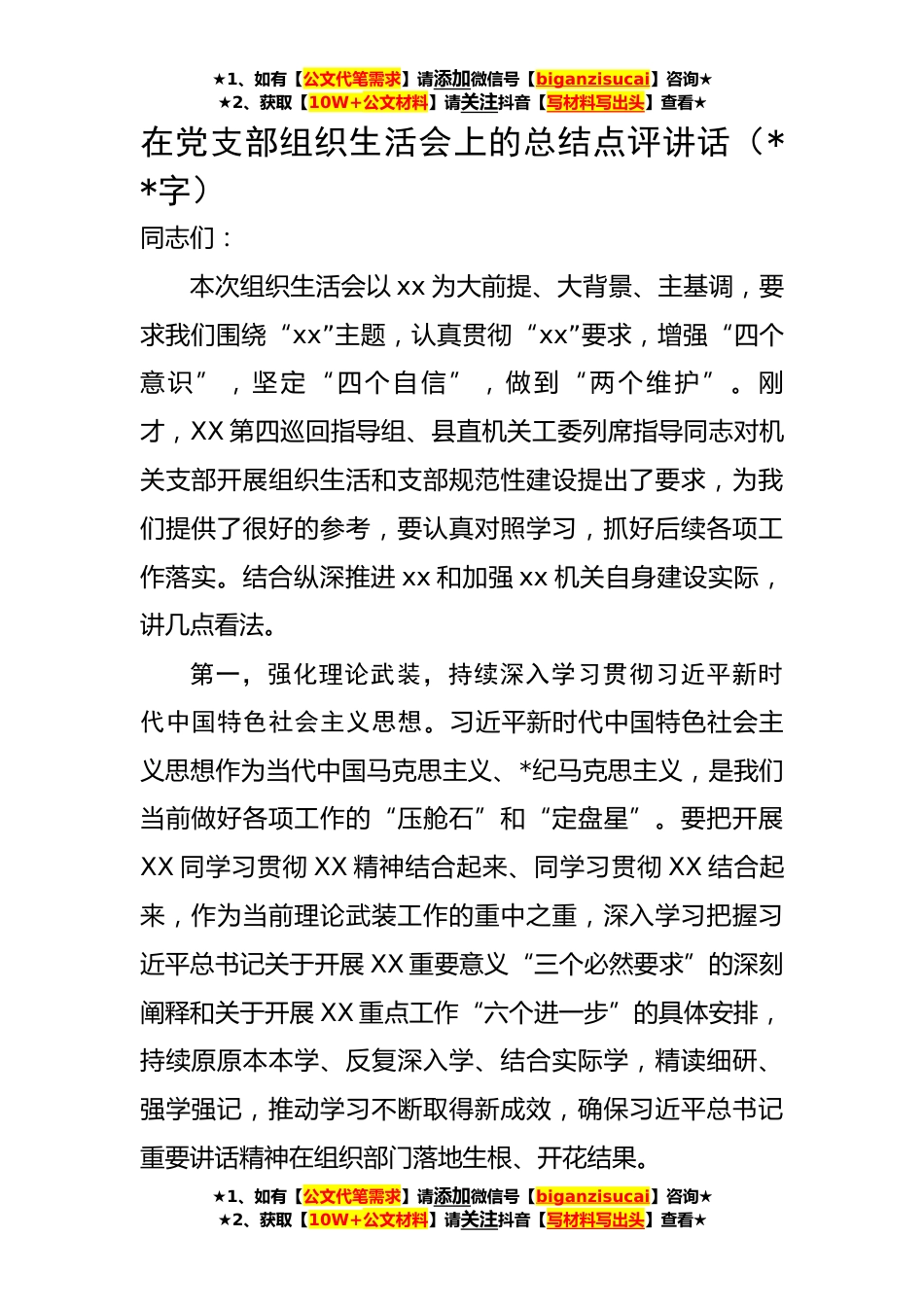★1、如有【公文代笔需求】请添加微信号【biganzisucai】咨询★★2、获取【10W+公文材料】请关注抖音【写材料写出头】查看★在党支部组织生活会上的总结点评讲话(**字)同志们:本次组织生活会以xx为大前提、大背景、主基调,要求我们围绕“xx”主题,认真贯彻“xx”要求,增强“四个意识”,坚定“四个自信”,做到“两个维护”。刚才,XX第四巡回指导组、县直机关工委列席指导同志对机关支部开展组织生活和支部规范性建设提出了要求,为我们提供了很好的参考,要认真对照学习,抓好后续各项工作落实。结合纵深推进xx和加强xx机关自身建设实际,讲几点看法。第一,强化理论武装,持续深入学习贯彻习近平新时代中国特色社会主义思想。习近平新时代中国特色社会主义思想作为当代中国马克思主义、*纪马克思主义,是...
