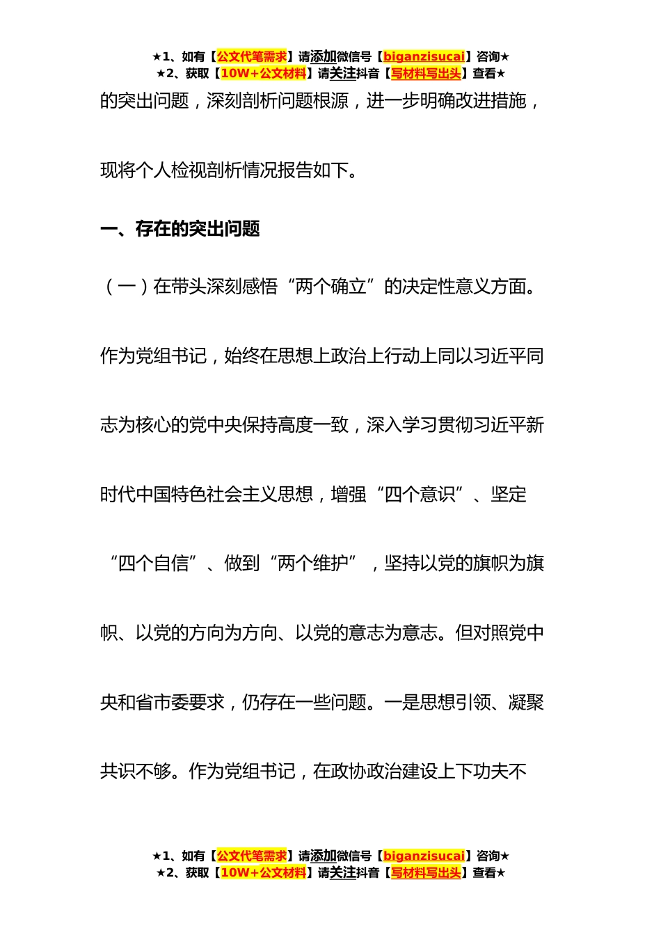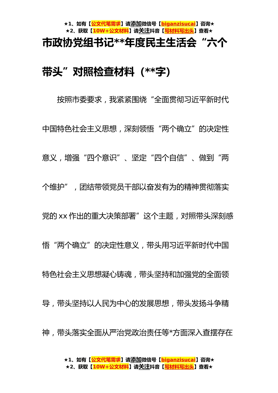 ★1、如有【公文代笔需求】请添加微信号【biganzisucai】咨询★★2、获取【10W+公文材料】请关注抖音【写材料写出头】查看★市政协党组书记**年度民主生活会“六个带头”对照检查材料(**字)按照市委要求,我紧紧围绕“全面贯彻习近平新时代中国特色社会主义思想,深刻领悟“两个确立”的决定性意义,增强“四个意识”、坚定“四个自信”、做到“两个维护”,团结带领党员干部以奋发有为的精神贯彻落实党的xx作出的重大决策部署”这个主题,对照带头深刻感悟“两个确立”的决定性意义,带头用习近平新时代中国特色社会主义思想凝心铸魂,带头坚持和加强党的全面领导,带头坚持以人民为中心的发展思想,带头发扬斗争精神,带头落实全面从严治党政治责任等*方面深入查摆存在★1、如有【公文代笔需求】请添加微信号...