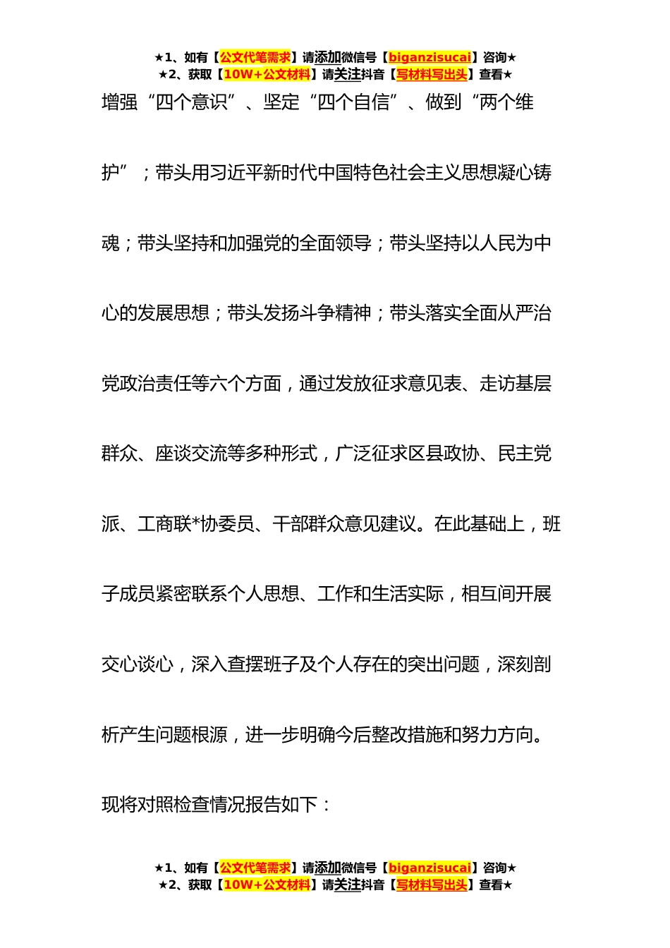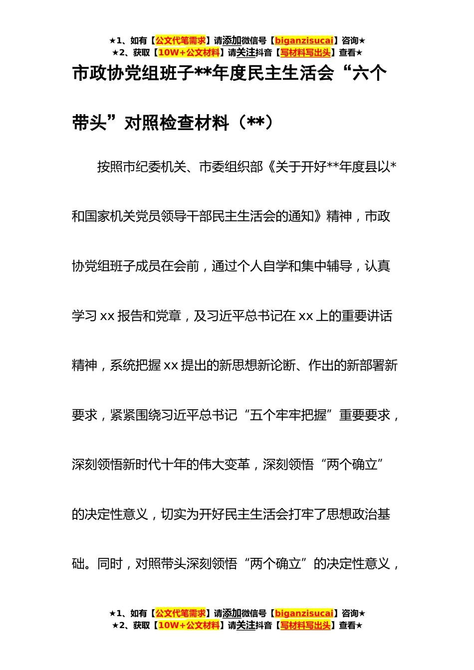 ★1、如有【公文代笔需求】请添加微信号【biganzisucai】咨询★★2、获取【10W+公文材料】请关注抖音【写材料写出头】查看★市政协党组班子**年度民主生活会“六个带头”对照检查材料(**)按照市纪委机关、市委组织部《关于开好**年度县以*和国家机关党员领导干部民主生活会的通知》精神,市政协党组班子成员在会前,通过个人自学和集中辅导,认真学习xx报告和党章,及习近平总书记在xx上的重要讲话精神,系统把握xx提出的新思想新论断、作出的新部署新要求,紧紧围绕习近平总书记“五个牢牢把握”重要要求,深刻领悟新时代十年的伟大变革,深刻领悟“两个确立”的决定性意义,切实为开好民主生活会打牢了思想政治基础。同时,对照带头深刻领悟“两个确立”的决定性意义,★1、如有【公文代笔需求】请添加微信号...