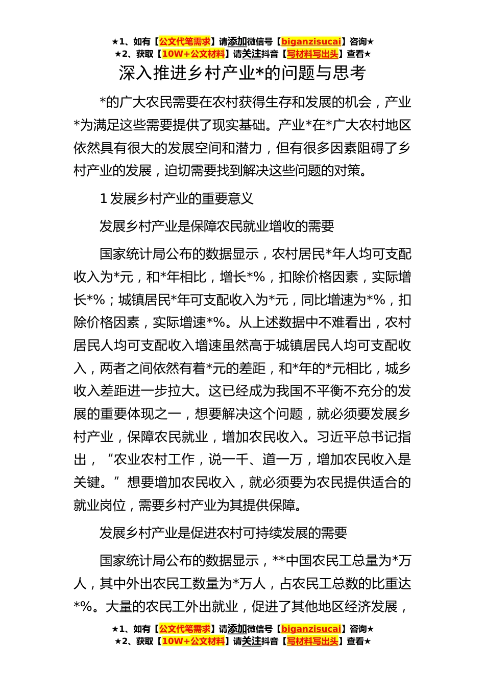 ★1、如有【公文代笔需求】请添加微信号【biganzisucai】咨询★★2、获取【10W+公文材料】请关注抖音【写材料写出头】查看★★1、如有【公文代笔需求】请添加微信号【biganzisucai】咨询★★2、获取【10W+公文材料】请关注抖音【写材料写出头】查看★★1、如有【公文代笔需求】请添加微信号【biganzisucai】咨询★★2、获取【10W+公文材料】请关注抖音【写材料写出头】查看★深入推进乡村产业*的问题与思考*的广大农民需要在农村获得生存和发展的机会,产业*为满足这些需要提供了现实基础。产业*在*广大农村地区依然具有很大的发展空间和潜力,但有很多因素阻碍了乡村产业的发展,迫切需要找到解决这些问题的对策。1发展乡村产业的重要意义发展乡村产业是保障农民就业增收的需要国家统计局公布的数据显示,农村居...