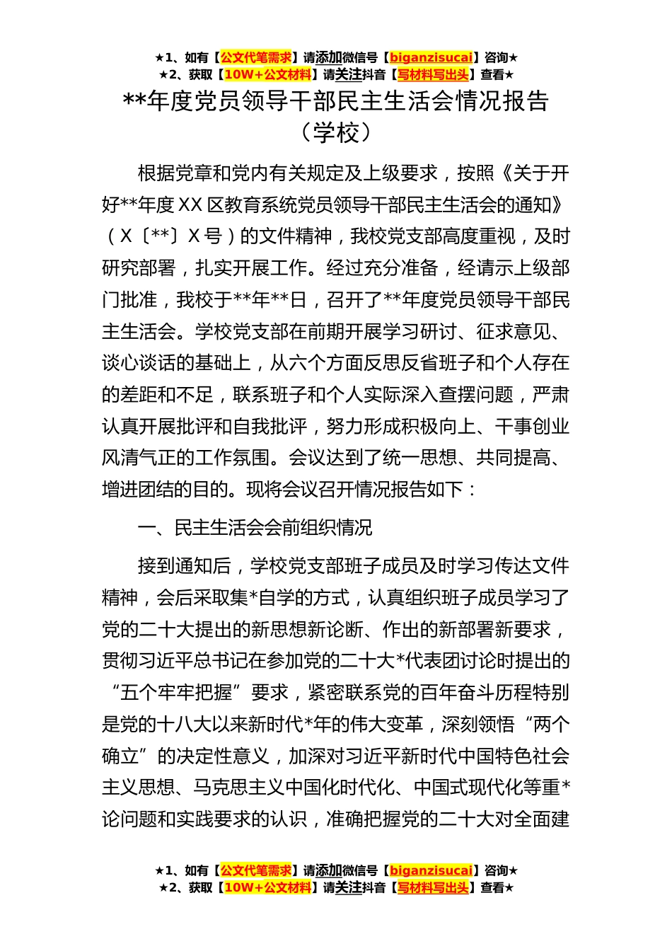 ★1、如有【公文代笔需求】请添加微信号【biganzisucai】咨询★★2、获取【10W+公文材料】请关注抖音【写材料写出头】查看★★1、如有【公文代笔需求】请添加微信号【biganzisucai】咨询★★2、获取【10W+公文材料】请关注抖音【写材料写出头】查看★★1、如有【公文代笔需求】请添加微信号【biganzisucai】咨询★★2、获取【10W+公文材料】请关注抖音【写材料写出头】查看★**年度党员领导干部民主生活会情况报告(学校)根据党章和党内有关规定及上级要求,按照《关于开好**年度XX区教育系统党员领导干部民主生活会的通知》(X〔**〕X号)的文件精神,我校党支部高度重视,及时研究部署,扎实开展工作。经过充分准备,经请示上级部门批准,我校于**年**日,召开了**年度党员领导干部民主生活会。学校党支部在前...
