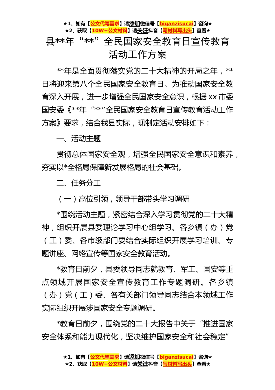 ★1、如有【公文代笔需求】请添加微信号【biganzisucai】咨询★★2、获取【10W+公文材料】请关注抖音【写材料写出头】查看★★1、如有【公文代笔需求】请添加微信号【biganzisucai】咨询★★2、获取【10W+公文材料】请关注抖音【写材料写出头】查看★★1、如有【公文代笔需求】请添加微信号【biganzisucai】咨询★★2、获取【10W+公文材料】请关注抖音【写材料写出头】查看★县**年“**”全民国家安全教育日宣传教育活动工作方案**年是全面贯彻落实党的二十大精神的开局之年,**日将迎来第八个全民国家安全教育日。为推动国家安全教育深入开展,进一步增强全民国家安全意识,根据xx市委国安委《**年“**”全民国家安全教育日宣传教育活动工作方案》要求,结合我县实际,现制定活动安排如下:一、活动主题贯彻总体...