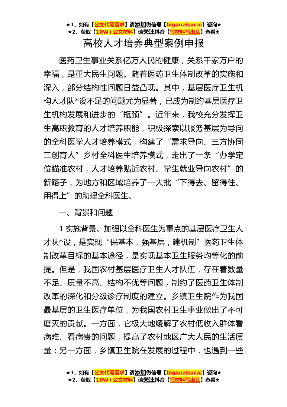 ★1、如有【公文代笔需求】请添加微信号【biganzisucai】咨询★★2、获取【10W+公文材料】请关注抖音【写材料写出头】查看★★1、如有【公文代笔需求】请添加微信号【biganzisucai】咨询★★2、获取【10W+公文材料】请关注抖音【写材料写出头】查看★★1、如有【公文代笔需求】请添加微信号【biganzisucai】咨询★★2、获取【10W+公文材料】请关注抖音【写材料写出头】查看★高校人才培养典型案例申报医药卫生事业关系亿万人民的健康,关系千家万户的幸福,是重大民生问题。随着医药卫生体制改革的实施和深入,部分结构性问题日益凸现。其中,基层医疗卫生机构人才队*设不足的问题尤为显著,已成为制约基层医疗卫生机构发展和进步的“瓶颈”。近年来,我校充分发挥卫生高职教育的人才培养职能,积极探索以服务基层...