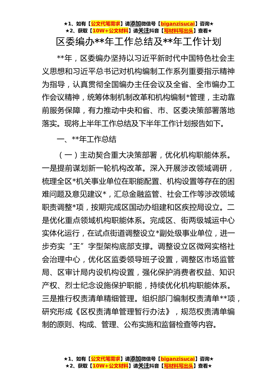 ★1、如有【公文代笔需求】请添加微信号【biganzisucai】咨询★★2、获取【10W+公文材料】请关注抖音【写材料写出头】查看★★1、如有【公文代笔需求】请添加微信号【biganzisucai】咨询★★2、获取【10W+公文材料】请关注抖音【写材料写出头】查看★★1、如有【公文代笔需求】请添加微信号【biganzisucai】咨询★★2、获取【10W+公文材料】请关注抖音【写材料写出头】查看★区委编办**年工作总结及**年工作计划**年,区委编办坚持以习近平新时代中国特色社会主义思想和习近平总书记对机构编制工作系列重要指示精神为指导,认真贯彻全国编办主任会议及全省、全市编办工作会议精神,统筹体制机制改革和机构编制*管理,主动靠前服务保障,有力推动中央和省、市、区委决策部署落地落实。现将上半年工作总结及下半年工...