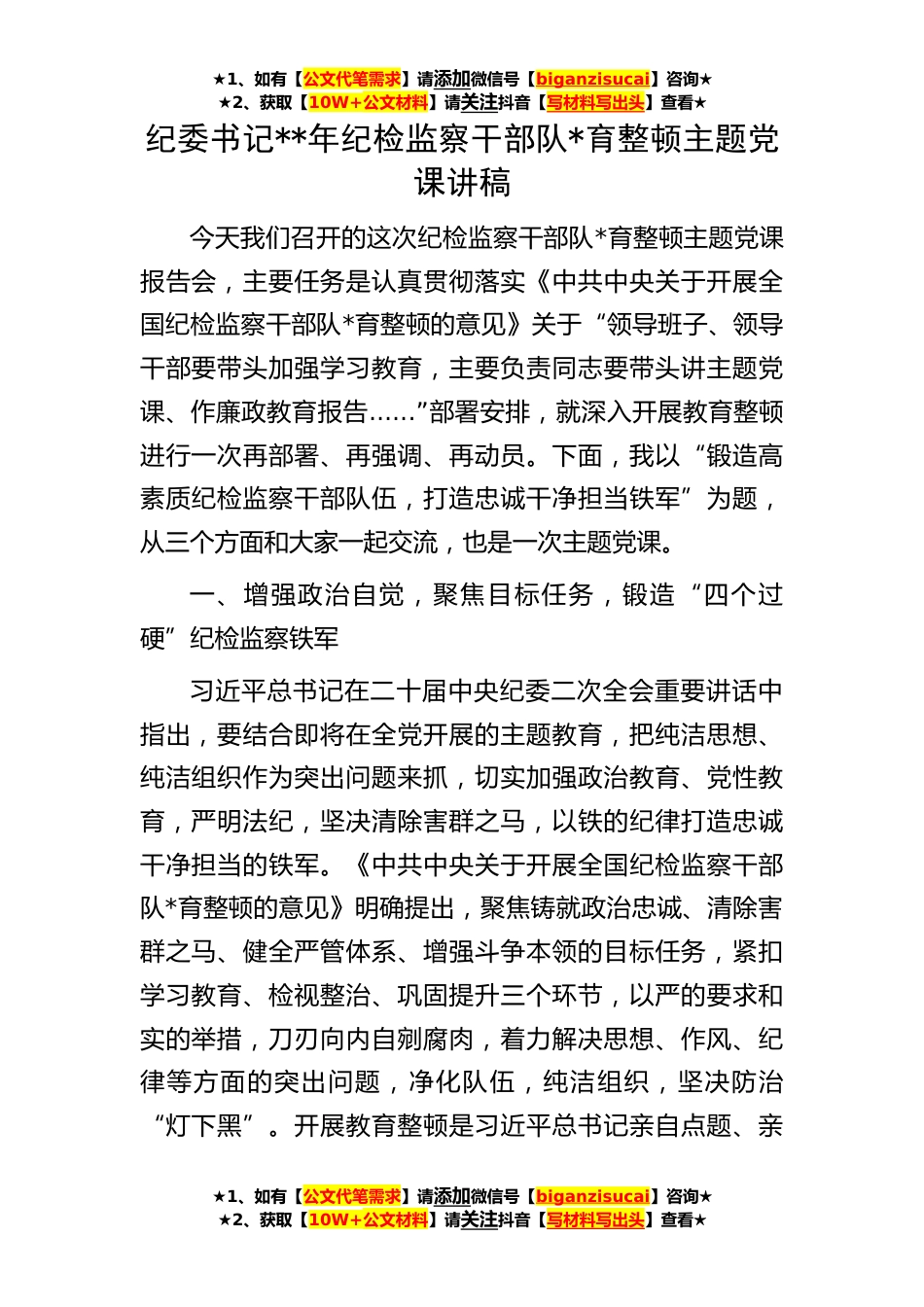 ★1、如有【公文代笔需求】请添加微信号【biganzisucai】咨询★★2、获取【10W+公文材料】请关注抖音【写材料写出头】查看★★1、如有【公文代笔需求】请添加微信号【biganzisucai】咨询★★2、获取【10W+公文材料】请关注抖音【写材料写出头】查看★★1、如有【公文代笔需求】请添加微信号【biganzisucai】咨询★★2、获取【10W+公文材料】请关注抖音【写材料写出头】查看★纪委书记**年纪检监察干部队*育整顿主题党课讲稿今天我们召开的这次纪检监察干部队*育整顿主题党课报告会,主要任务是认真贯彻落实《中共中央关于开展全国纪检监察干部队*育整顿的意见》关于“领导班子、领导干部要带头加强学习教育,主要负责同志要带头讲主题党课、作廉政教育报告......”部署安排,就深入开展教育整顿进行一次再部署、再...