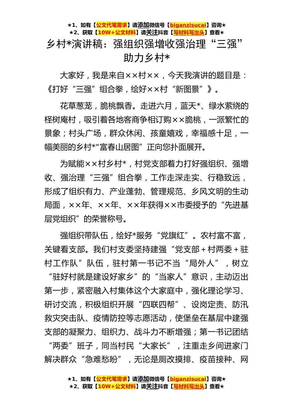 ★1、如有【公文代笔需求】请添加微信号【biganzisucai】咨询★★2、获取【10W+公文材料】请关注抖音【写材料写出头】查看★★1、如有【公文代笔需求】请添加微信号【biganzisucai】咨询★★2、获取【10W+公文材料】请关注抖音【写材料写出头】查看★★1、如有【公文代笔需求】请添加微信号【biganzisucai】咨询★★2、获取【10W+公文材料】请关注抖音【写材料写出头】查看★乡村*演讲稿:强组织强增收强治理“三强”助力乡村*大家好,我是来自××村××,今天我演讲的题目是:《打好“三强”组合拳,绘好××村“新图景”》。花草葱茏,脆桃飘香。走进六月,蓝天*、绿水萦绕的柽树庵村,吸引着各地客商争相订购××脆桃,一派繁忙的景象;村头广场,群众休闲、孩童嬉戏,幸福感十足,一幅美丽的乡村*“富春山居...